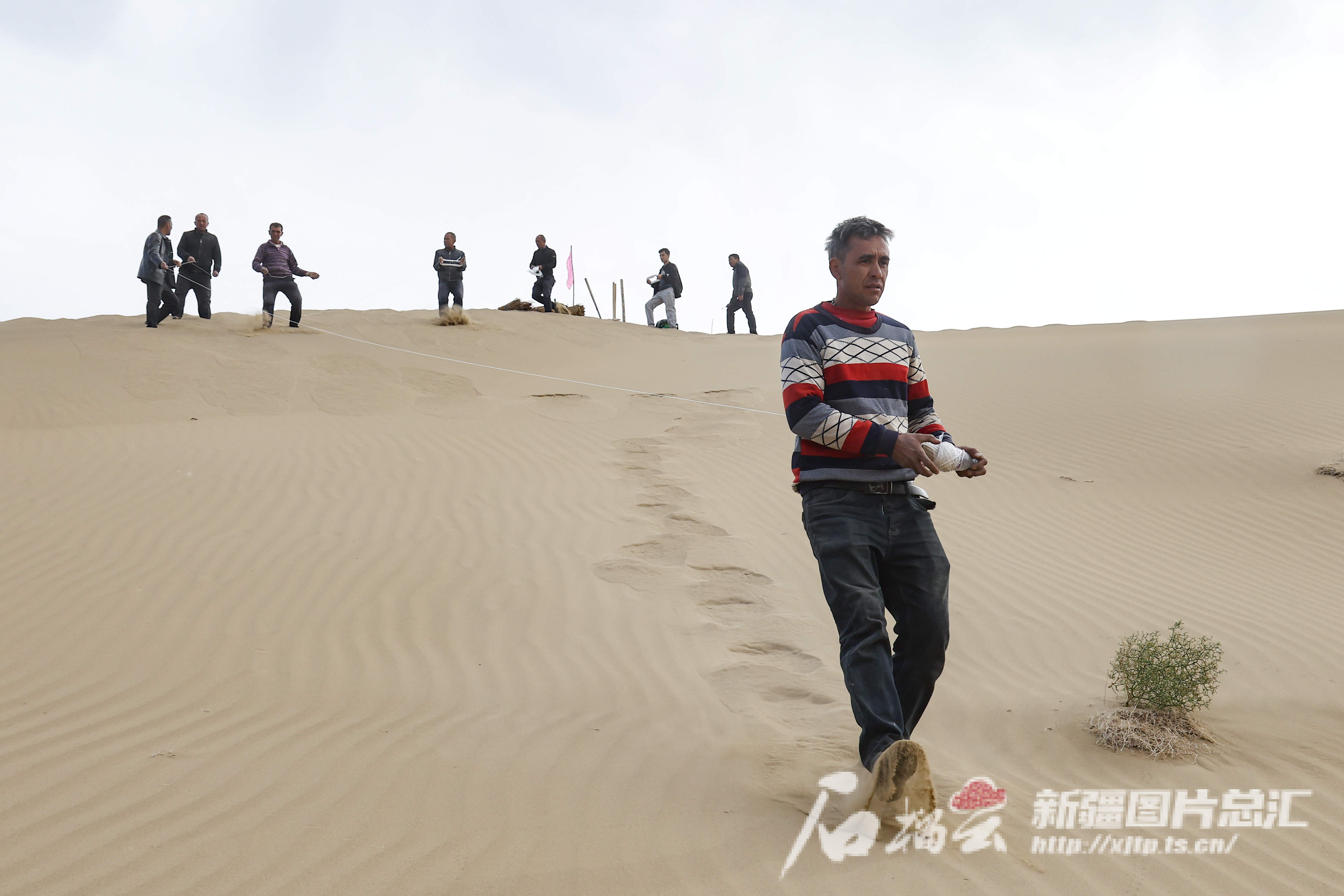 在奧依托格拉克鄉(xiāng)萬花園防沙治沙區(qū),當?shù)厝罕娬谝惶幐?0米左右的大沙丘前鋪設(shè)草方格,裁切、運送、拉線,各司其職。