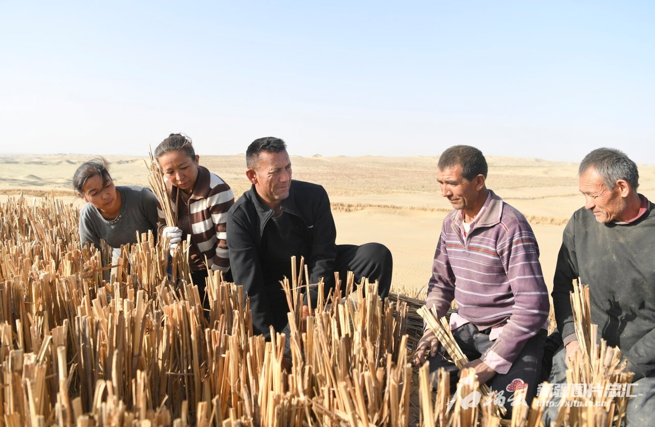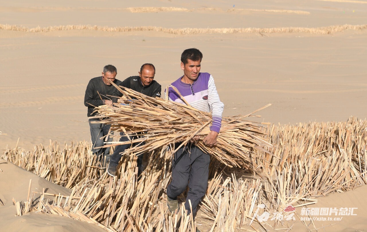 11月2日,當?shù)厝罕娫谟谔锟h奧依托格拉克鄉(xiāng)防沙治沙區(qū)搬運蘆葦。
