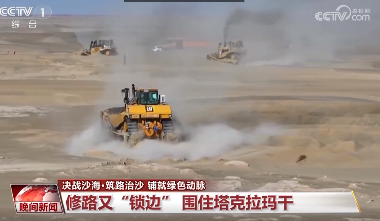 央視報(bào)道皮山縣沙漠鎖邊建設(shè)現(xiàn)場。 央視視頻截圖