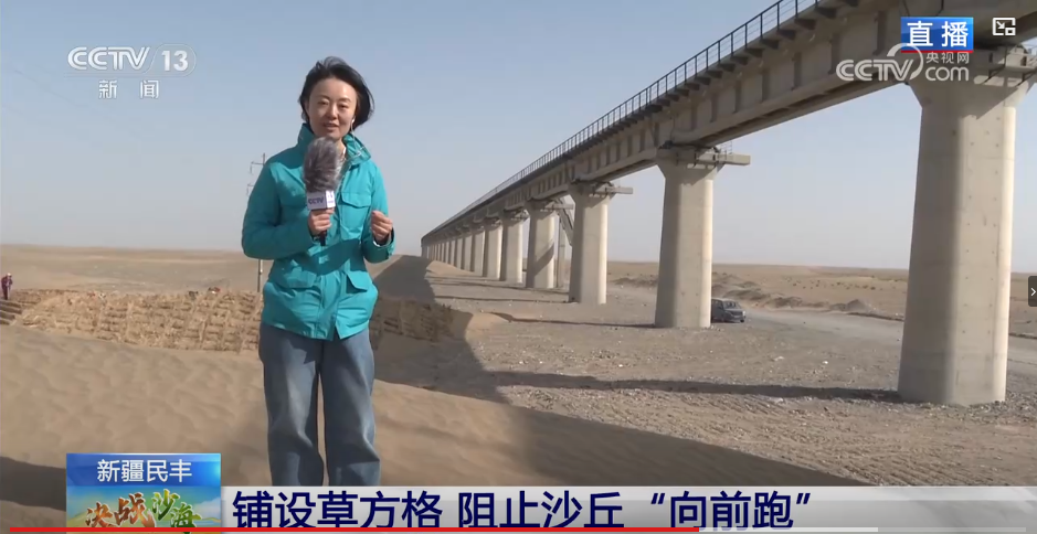 央視記者走進(jìn)民豐縣介紹草方格是如何守護(hù)道路安全。央視視頻截圖