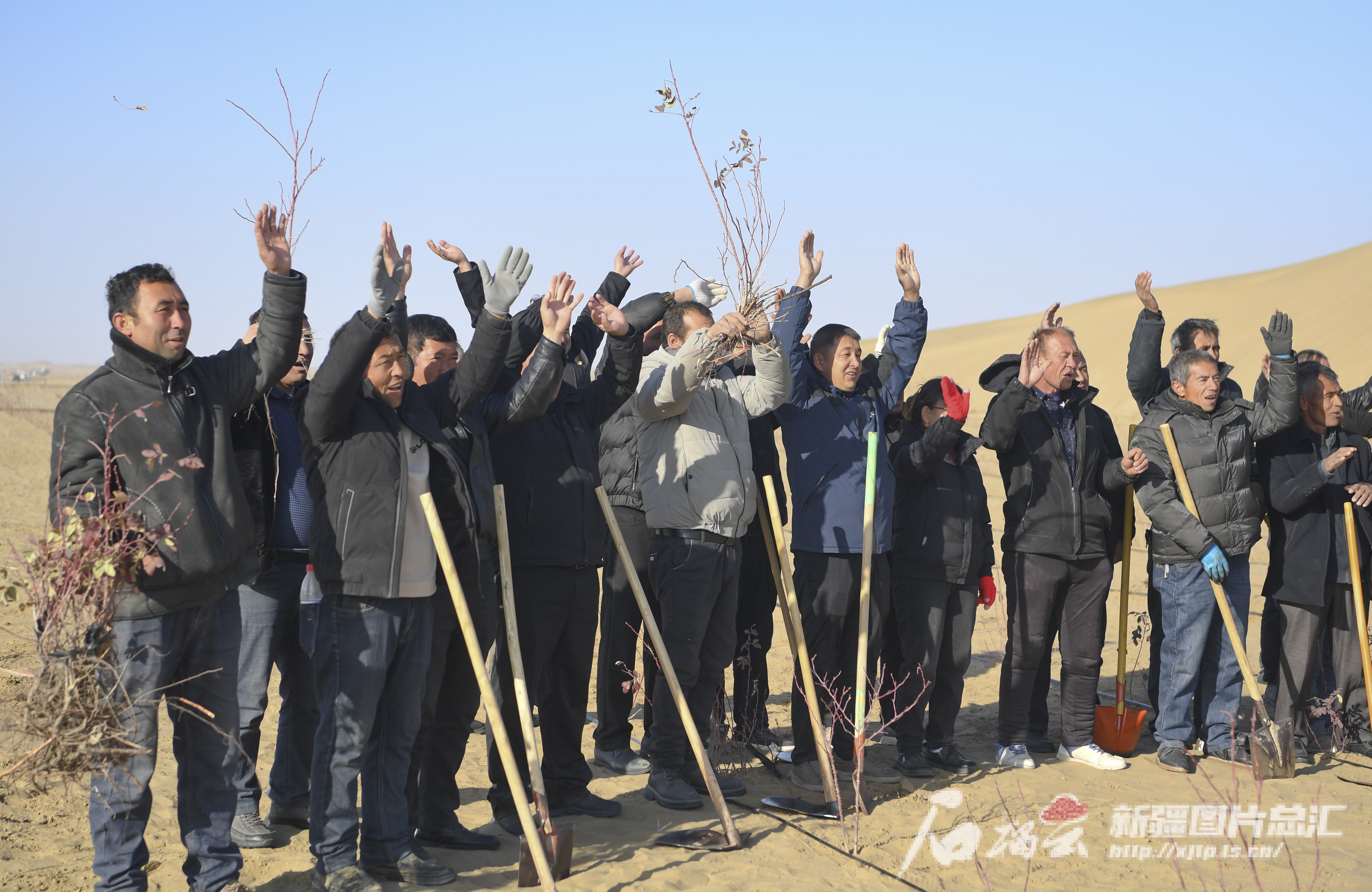 11月28日上午,和田地區(qū)于田縣奧依托格拉克鄉(xiāng)托格拉吾斯塘村村民在萬(wàn)花園防沙治沙區(qū)種植沙漠玫瑰樹苗。