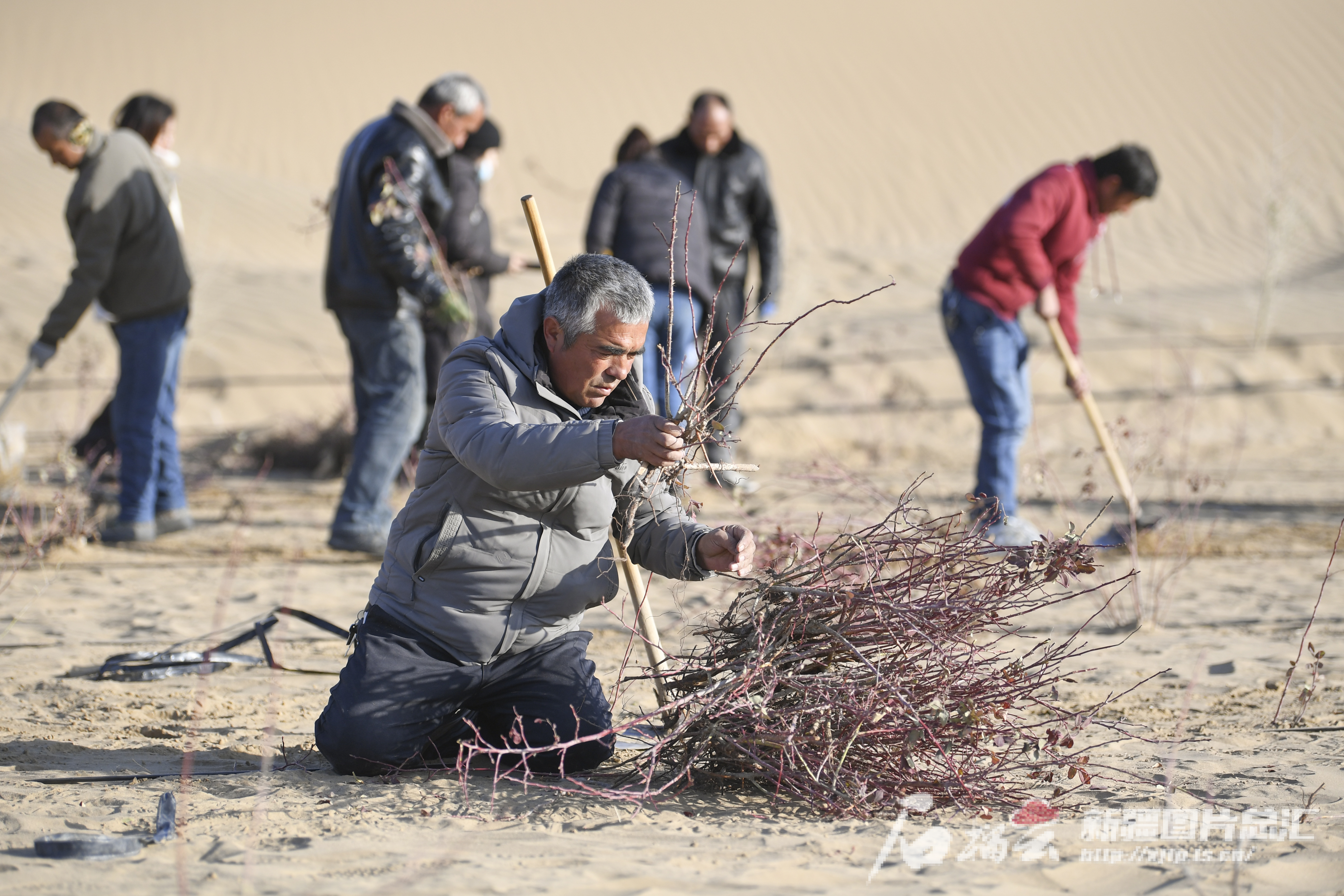 11月28日上午,和田地區(qū)于田縣奧依托格拉克鄉(xiāng)托格拉吾斯塘村村民在萬(wàn)花園防沙治沙區(qū)搬運(yùn)沙漠玫瑰樹苗。