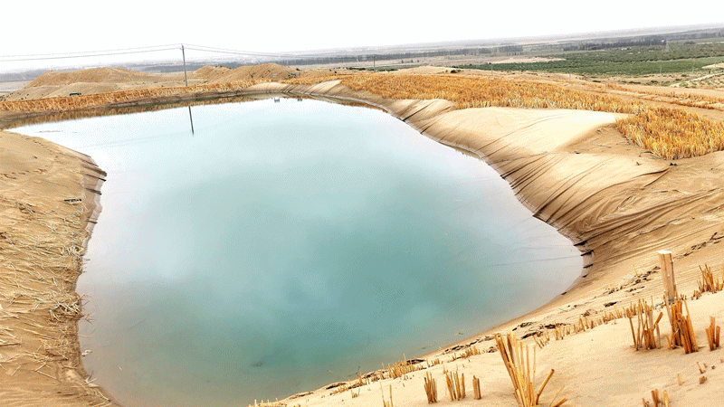 在沙丘頂部,可以看到一個(gè)巨大的蓄水池,這是于田縣在“梯田治沙”中摸索出的經(jīng)驗(yàn),將抽出的地下水置于沙丘頂部,通過(guò)光照提升水溫,有利于植被生長(zhǎng)。同時(shí),懸在高處的水與低處的植被區(qū)形成落差,抽水用電量能減少一半。