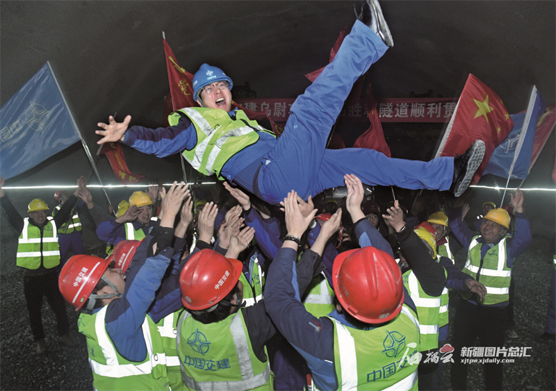 實(shí)施天山勝利隧道雙向?qū)Υ虻氖┕と藛T將工友拋起慶祝隧道貫通。韓亮/攝