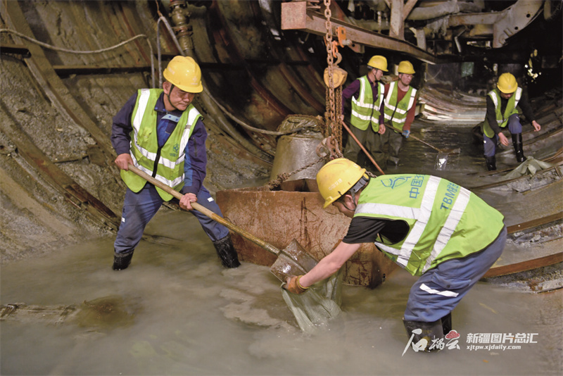 施工人員在烏尉土建第五標(biāo)段清理泥沙。韓亮/攝