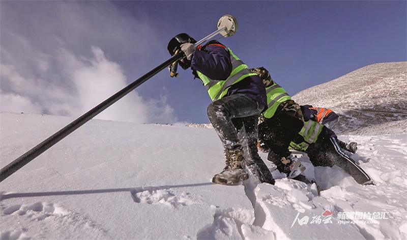 中國交建新疆烏尉公路包PPP項(xiàng)目烏尉土建第五標(biāo)段,施工人員背著測量設(shè)備在雪地里前行。韓亮/攝