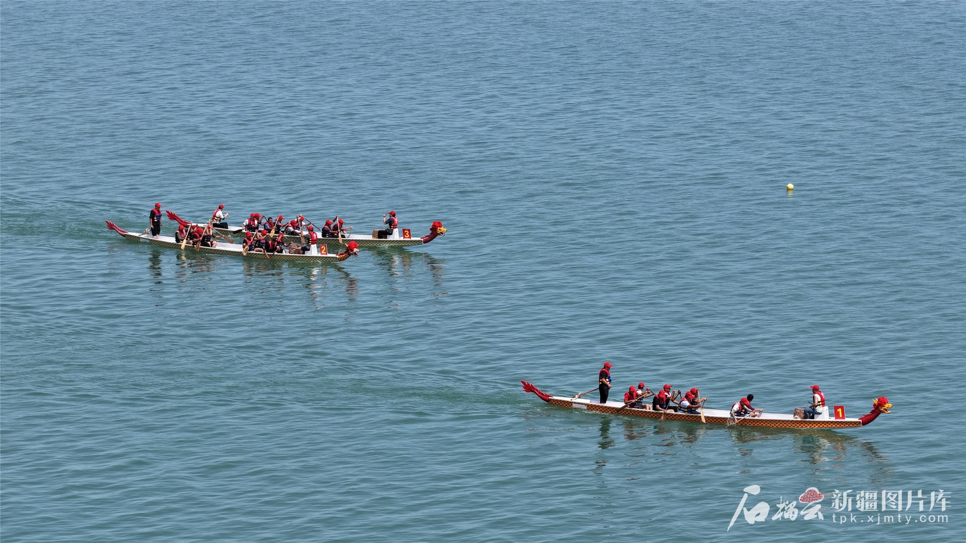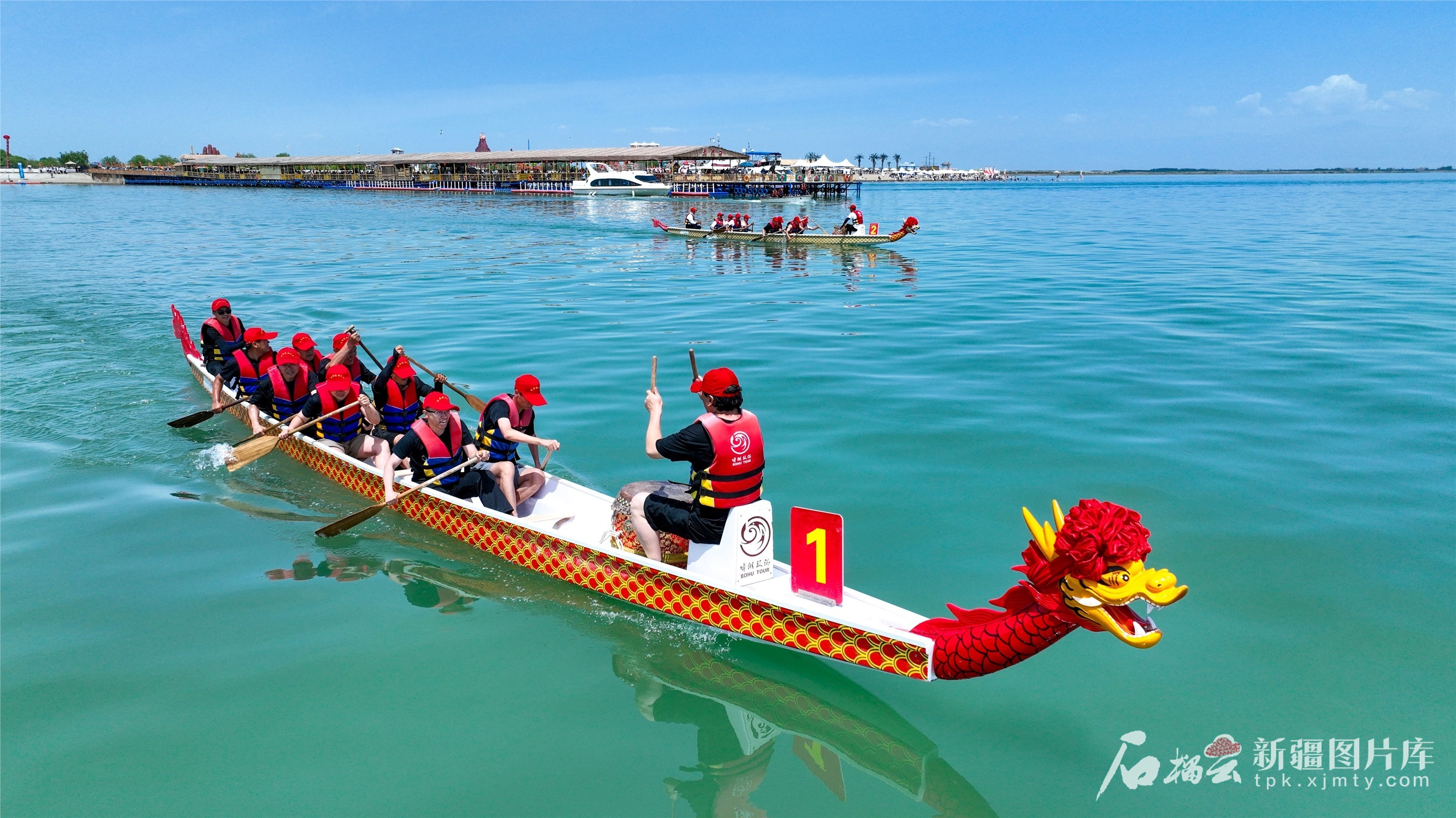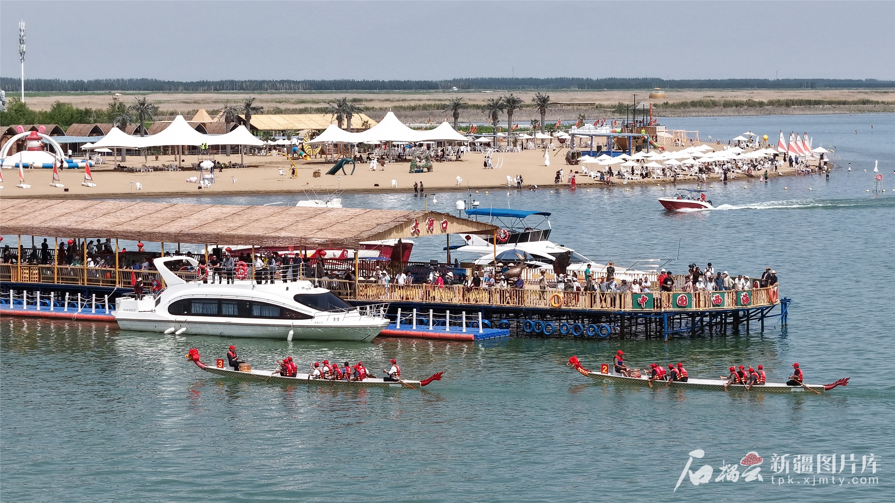 5月31日,端午小長假第一天,前來新疆博湖縣博斯騰湖景區(qū)歡度小長假的游客們不僅欣賞到了煙波浩渺的湖區(qū)風(fēng)景,還觀賞了一場龍舟競渡的激烈比賽。