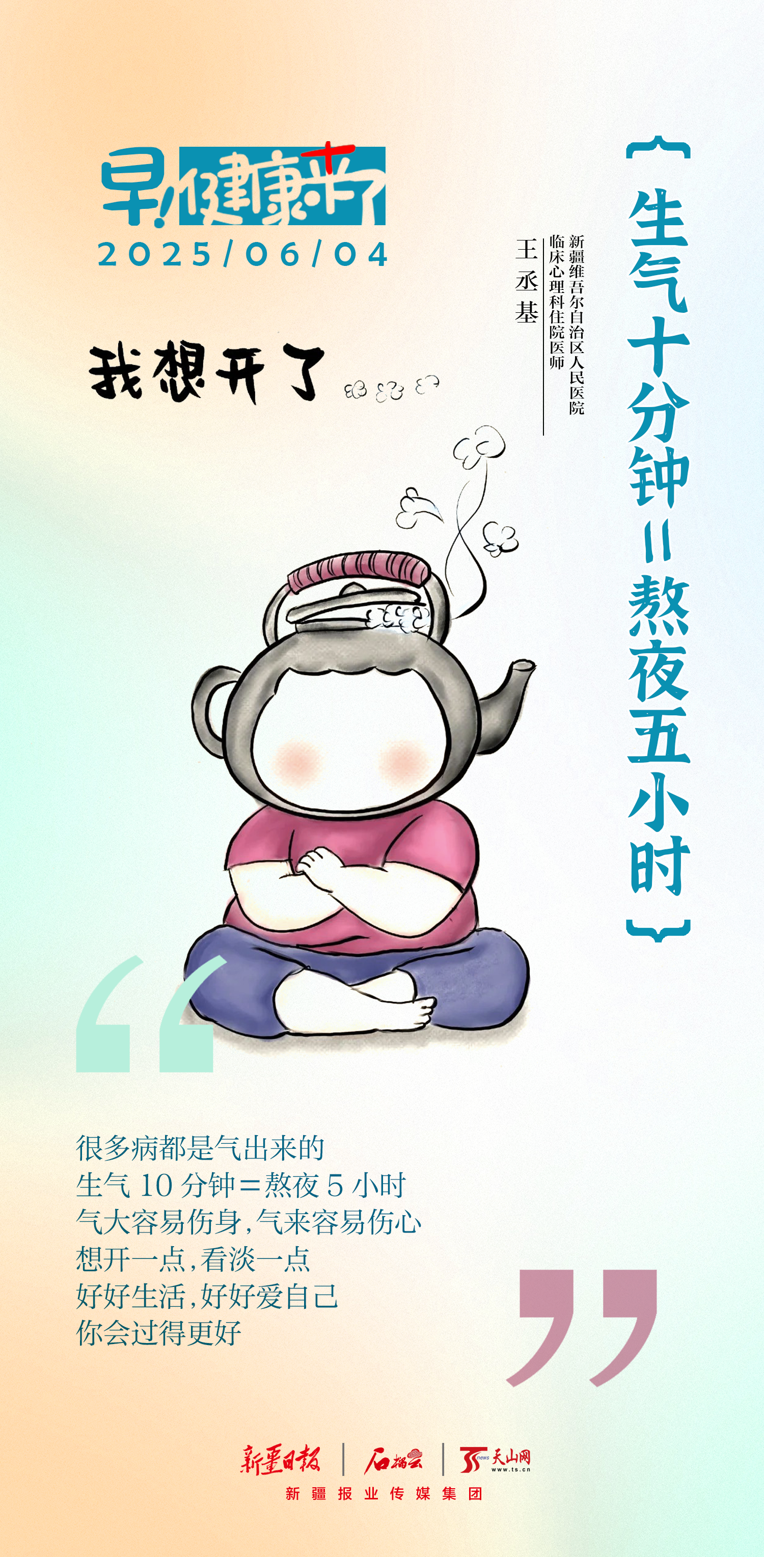 新疆維吾爾自治區(qū)人民醫(yī)院臨床心理科住院醫(yī)師王丞基提醒:生氣10分鐘對身體的消耗堪比熬夜5小時(shí)。學(xué)會管理情緒,遠(yuǎn)離“氣”出來的疾??!