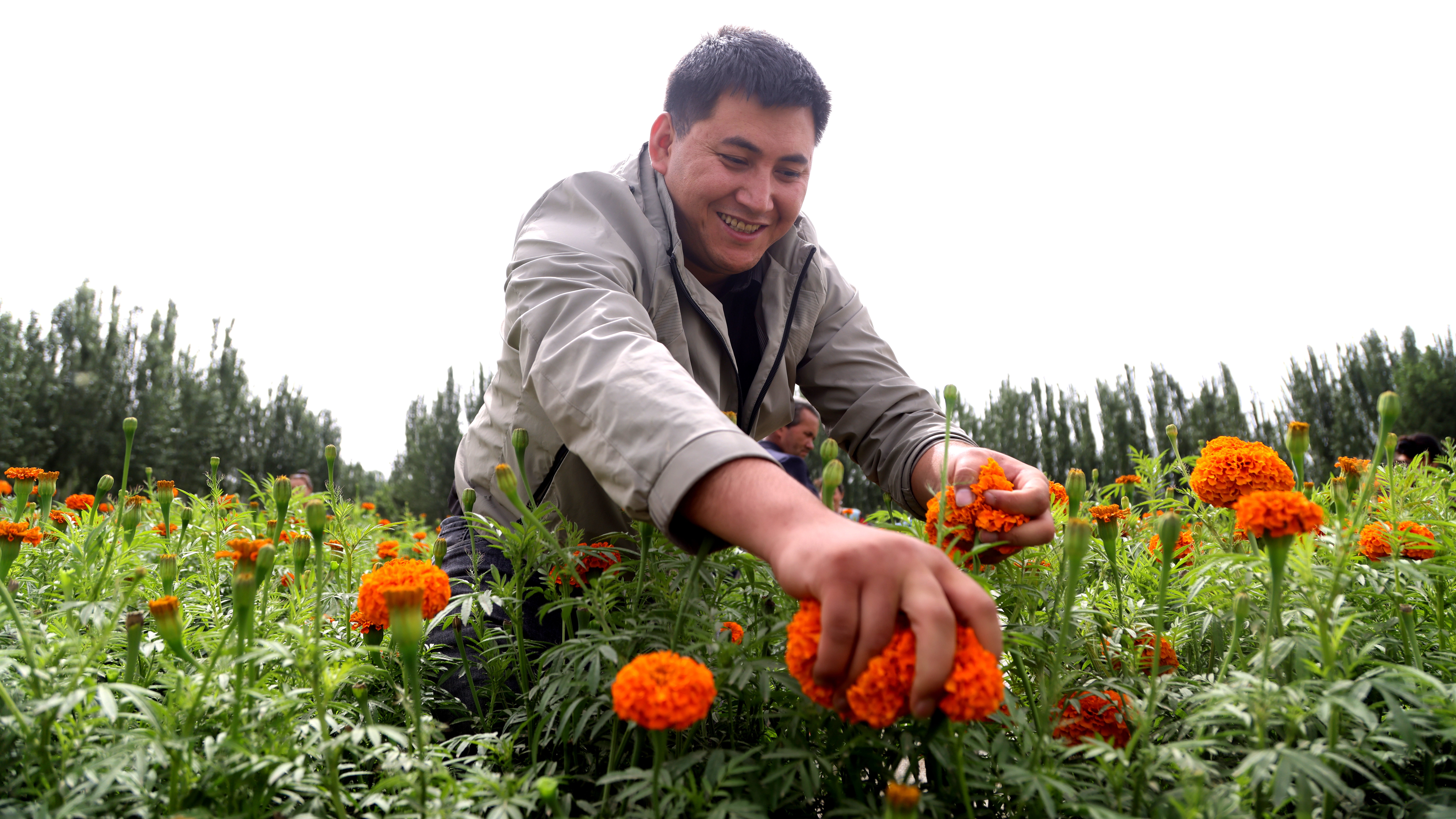 6月4日,在莎車(chē)縣英吾斯塘鄉(xiāng)的種植基地,連片的萬(wàn)壽菊在微風(fēng)中輕輕搖曳。村民穿梭其中,熟練地采摘著花朵,隨后將它們裝入袋中,田間地頭處處洋溢著豐收的喜悅。