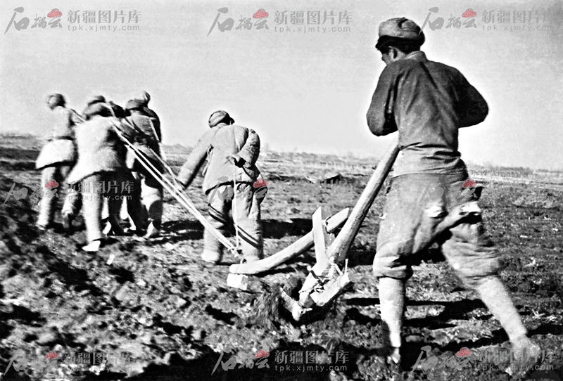 1950年4月2日,在疏勒縣草湖荒灘上,解放軍戰(zhàn)士犁地開荒。 袁國祥攝 圖片由新疆圖片庫提供
