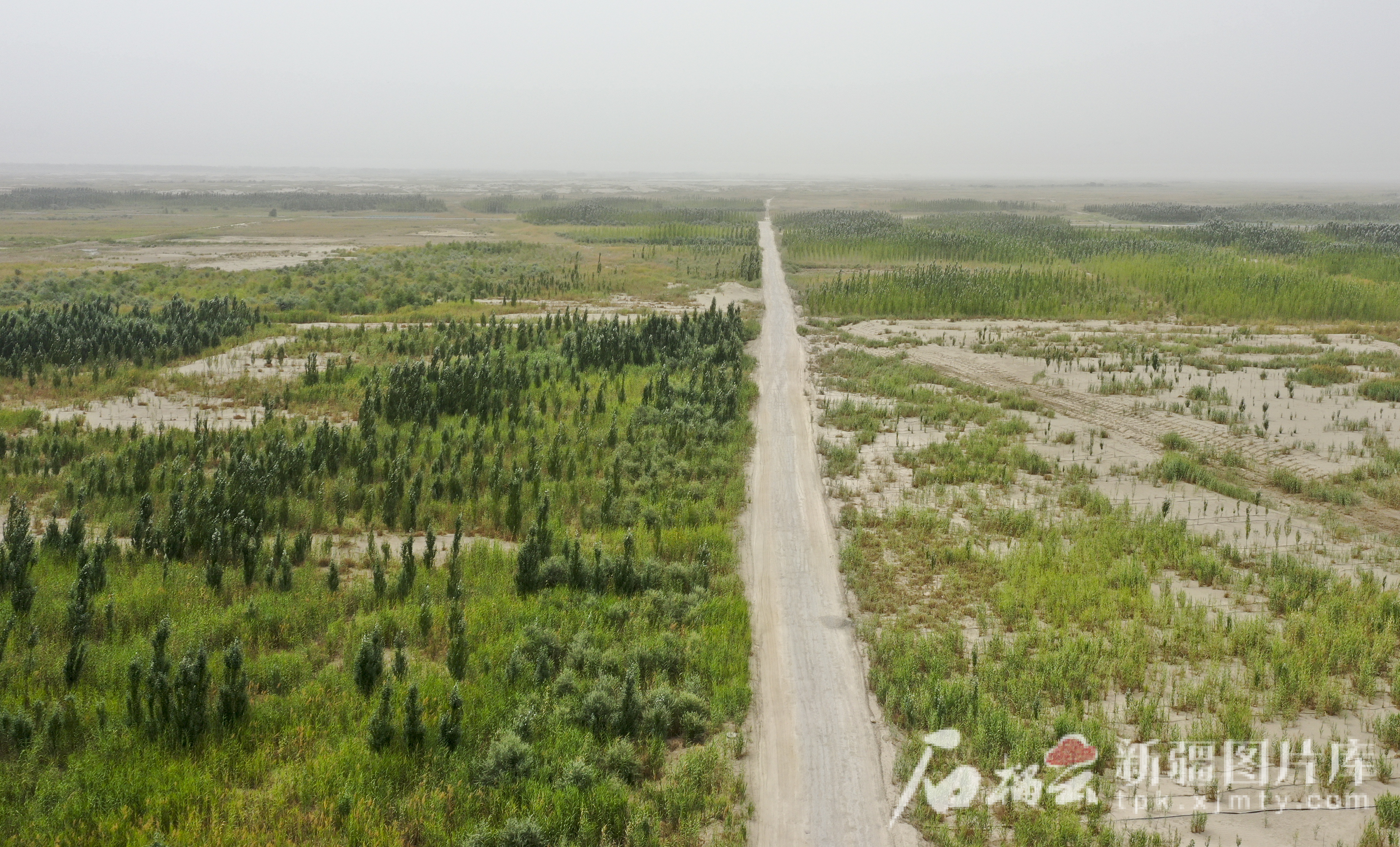 阿瓦提縣艾西曼荒漠化治理工程區(qū)種植的楊樹。(6月15日無人機攝)