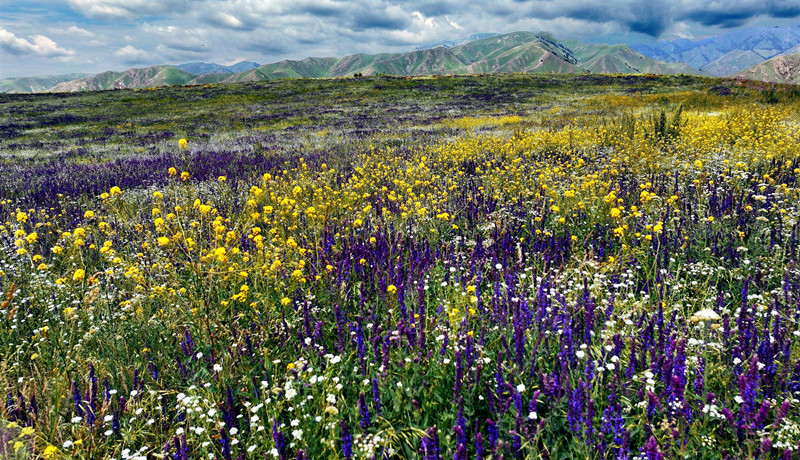 伊寧縣阿烏利亞鄉(xiāng)托遜村庫克木英草場上,數(shù)十種野生花卉成片綻放,將碧綠的草甸“染”出七彩云霞。(來源:伊寧縣融媒體中心)
