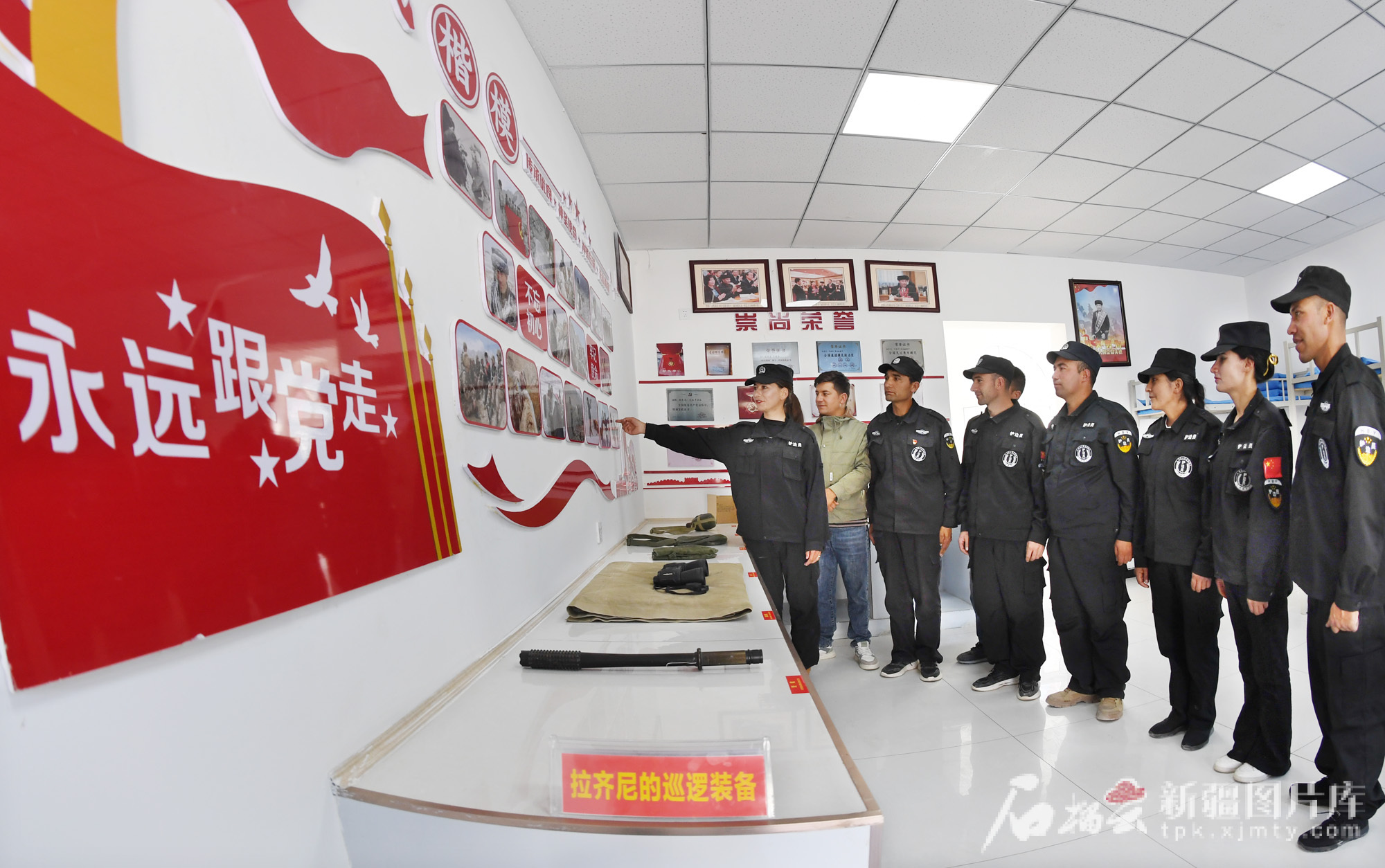 7月2日,護(hù)邊員在拉齊尼軍警民聯(lián)合執(zhí)勤工作站學(xué)習(xí)“時(shí)代楷?!崩R尼·巴依卡的事跡。