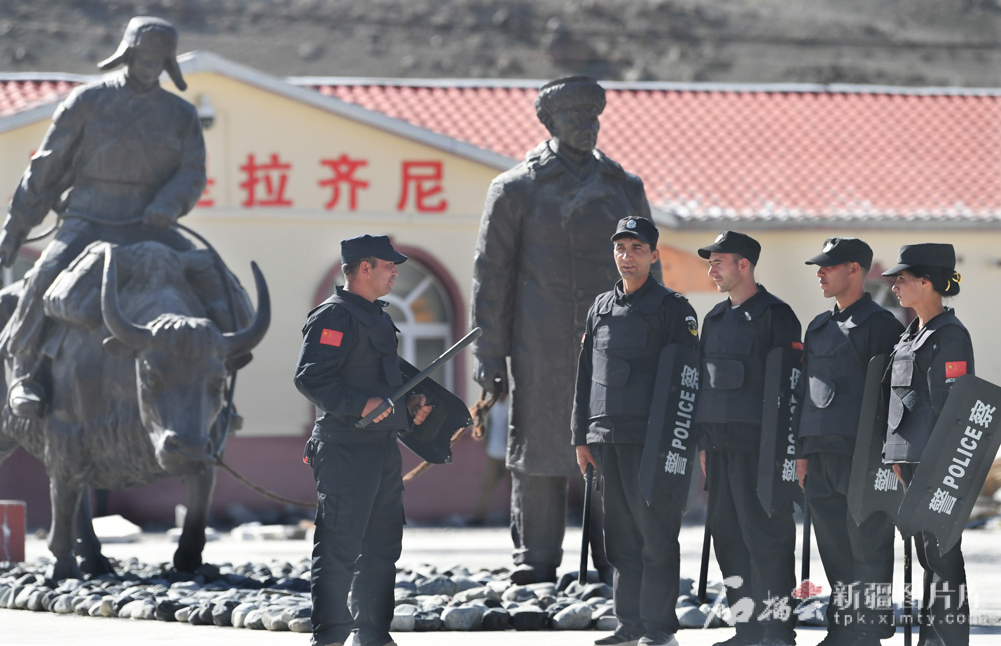 7月2日,護(hù)邊員在拉齊尼軍警民聯(lián)合執(zhí)勤工作站門前擦拭“時(shí)代楷模”拉齊尼·巴依卡的雕像。