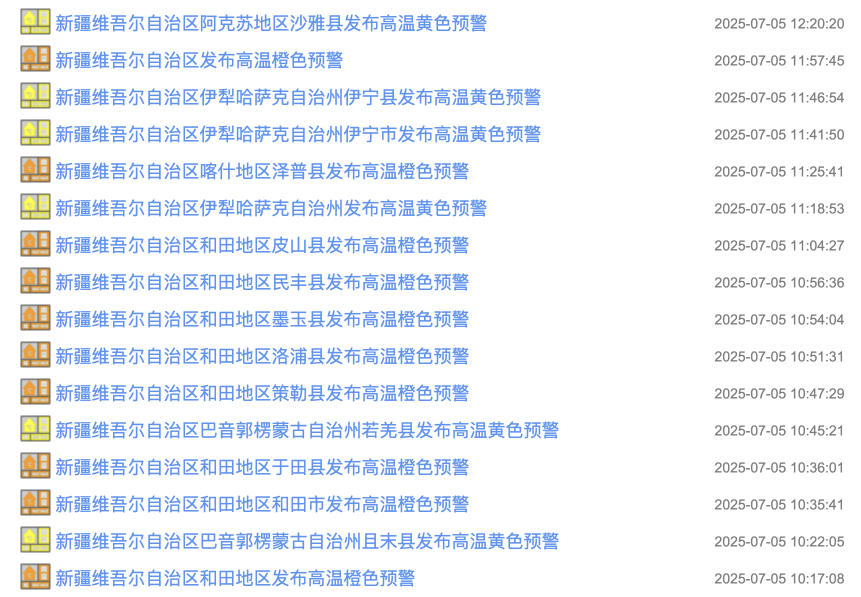 據(jù)中國天氣網(wǎng)預警信息,7月5日11時57分,新疆氣象臺將高溫黃色預警升級為橙色。