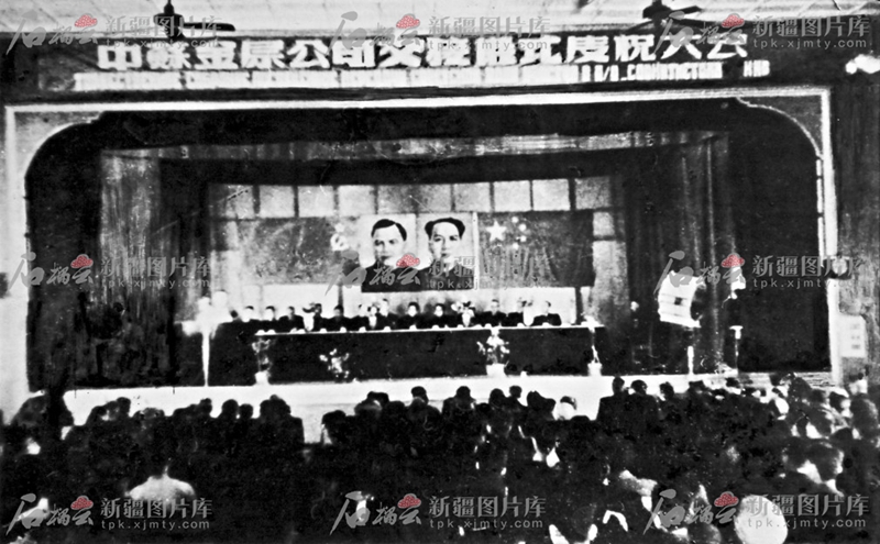 1954年12月30日,中蘇金屬公司蘇聯(lián)股份移交儀式慶祝大會會場。圖片由新疆圖片庫提供