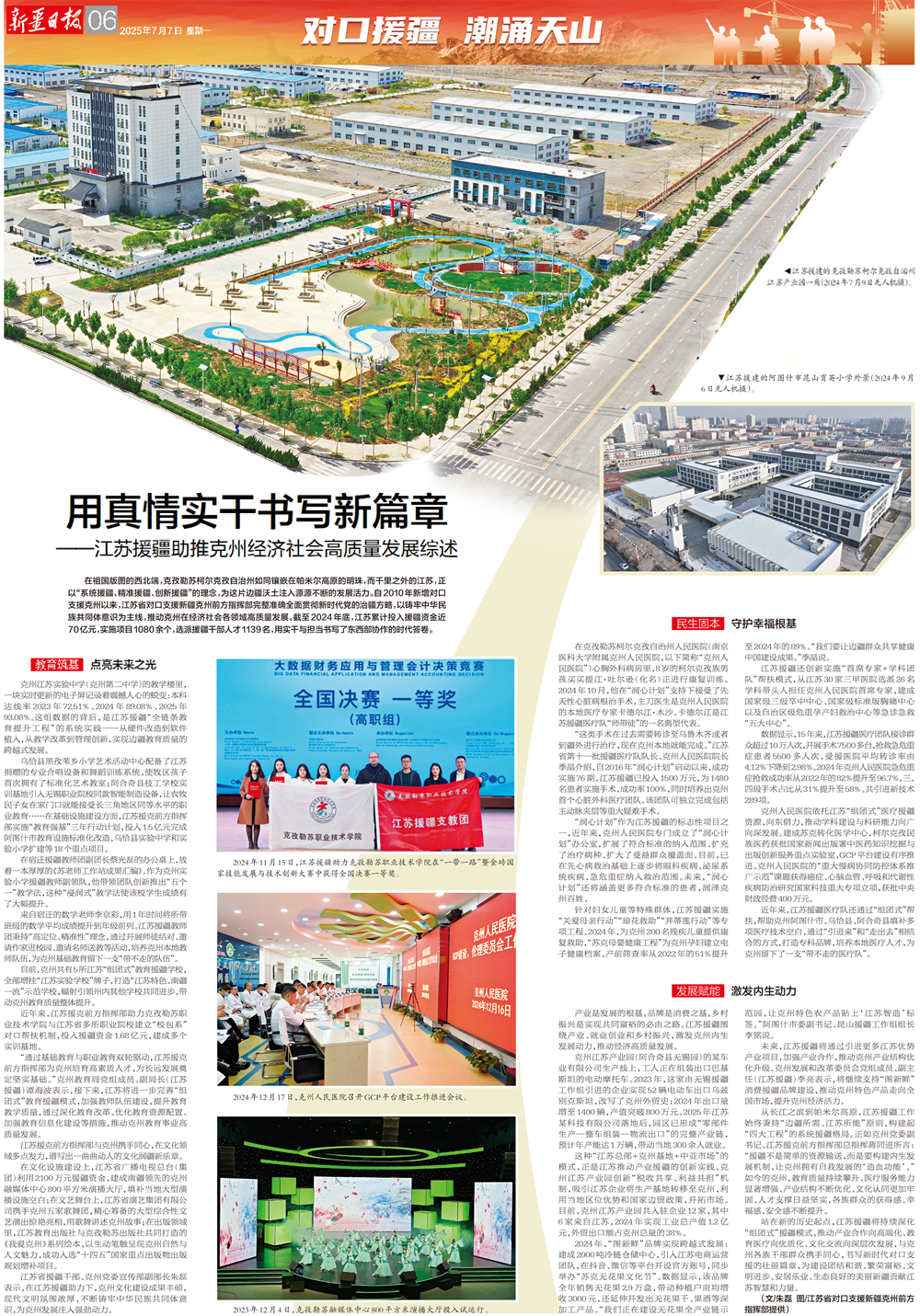 自2010年新增對(duì)口支援克州以來,江蘇省對(duì)口支援新疆克州前方指揮部完整準(zhǔn)確全面貫徹新時(shí)代黨的治疆方略,以鑄牢中華民族共同體意識(shí)為主線,推動(dòng)克州在經(jīng)濟(jì)社會(huì)各領(lǐng)域高質(zhì)量發(fā)展。截至2024年底,江蘇累計(jì)投入援疆資金近70億元,實(shí)施項(xiàng)目1080余個(gè),選派援疆干部人才1139名,用實(shí)干與擔(dān)當(dāng)書寫了東西部協(xié)作的時(shí)代答卷。詳情>>>