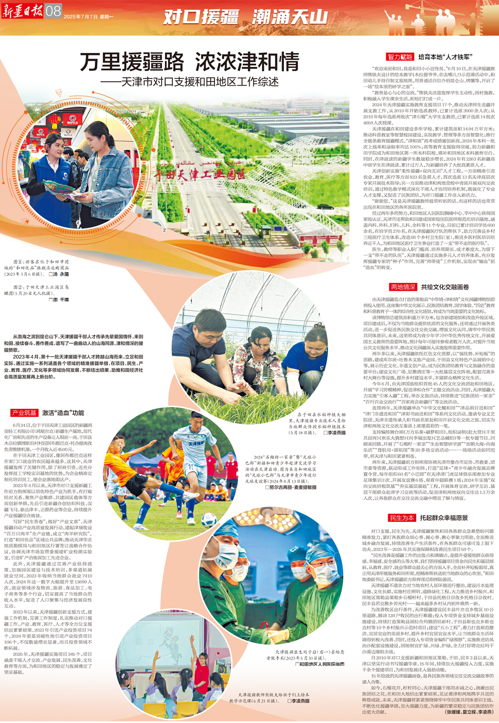 2023年4月,第十一批天津援疆干部人才跨越山海而來,立足和田實(shí)際,通過實(shí)施一系列涵蓋各個(gè)領(lǐng)域的精準(zhǔn)援疆舉措,在項(xiàng)目、民生、產(chǎn)業(yè)、教育、醫(yī)療、文化等多領(lǐng)域協(xié)同發(fā)展,不斷結(jié)出碩果,助推和田經(jīng)濟(jì)社會(huì)高質(zhì)量發(fā)展再上新臺(tái)階。詳情>>>