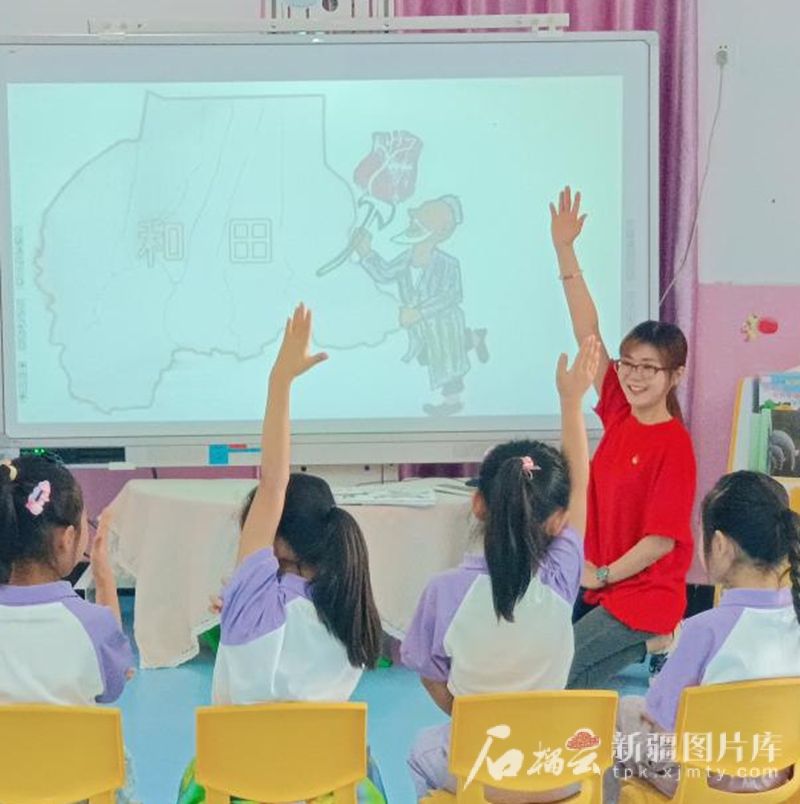 天津援疆教師熊鐵夫給孩子們上繪本教學(xué)示范課(6月21日攝)。李凌燕攝