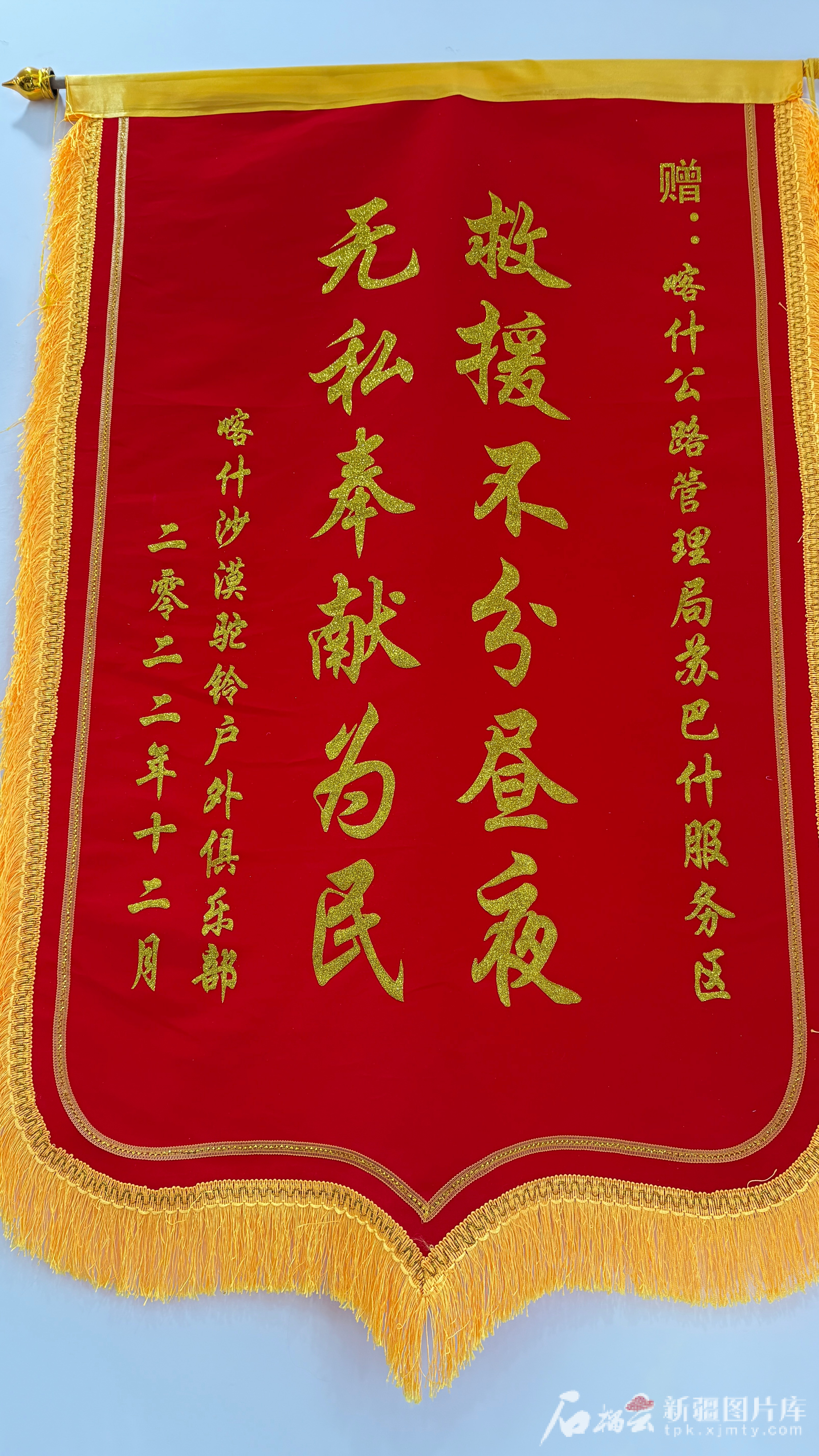 “這是我們的第一面錦旗?!碧K巴什服務區(qū)主任楊惠福指著左邊墻上的一面錦旗說,錦旗是2022年12月喀什沙漠駝鈴戶外俱樂部送來的,上書“救援不分晝夜,無私奉獻為民”。