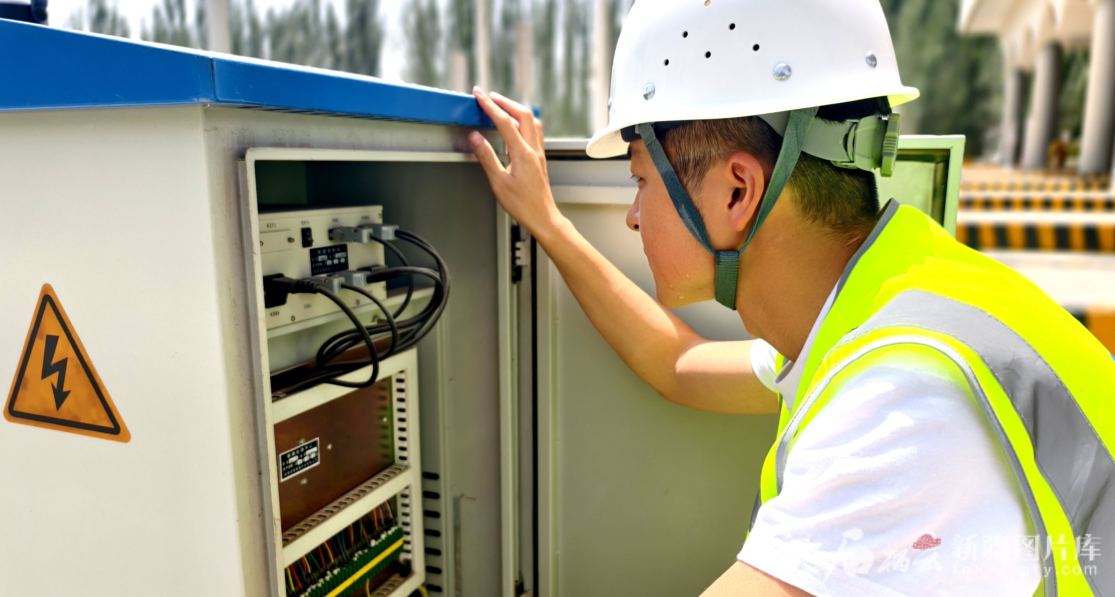 7月7日,新疆交投集團(tuán)喀什分公司安全員郭峰在烈日下檢查收費站機(jī)電設(shè)備。廖婷攝