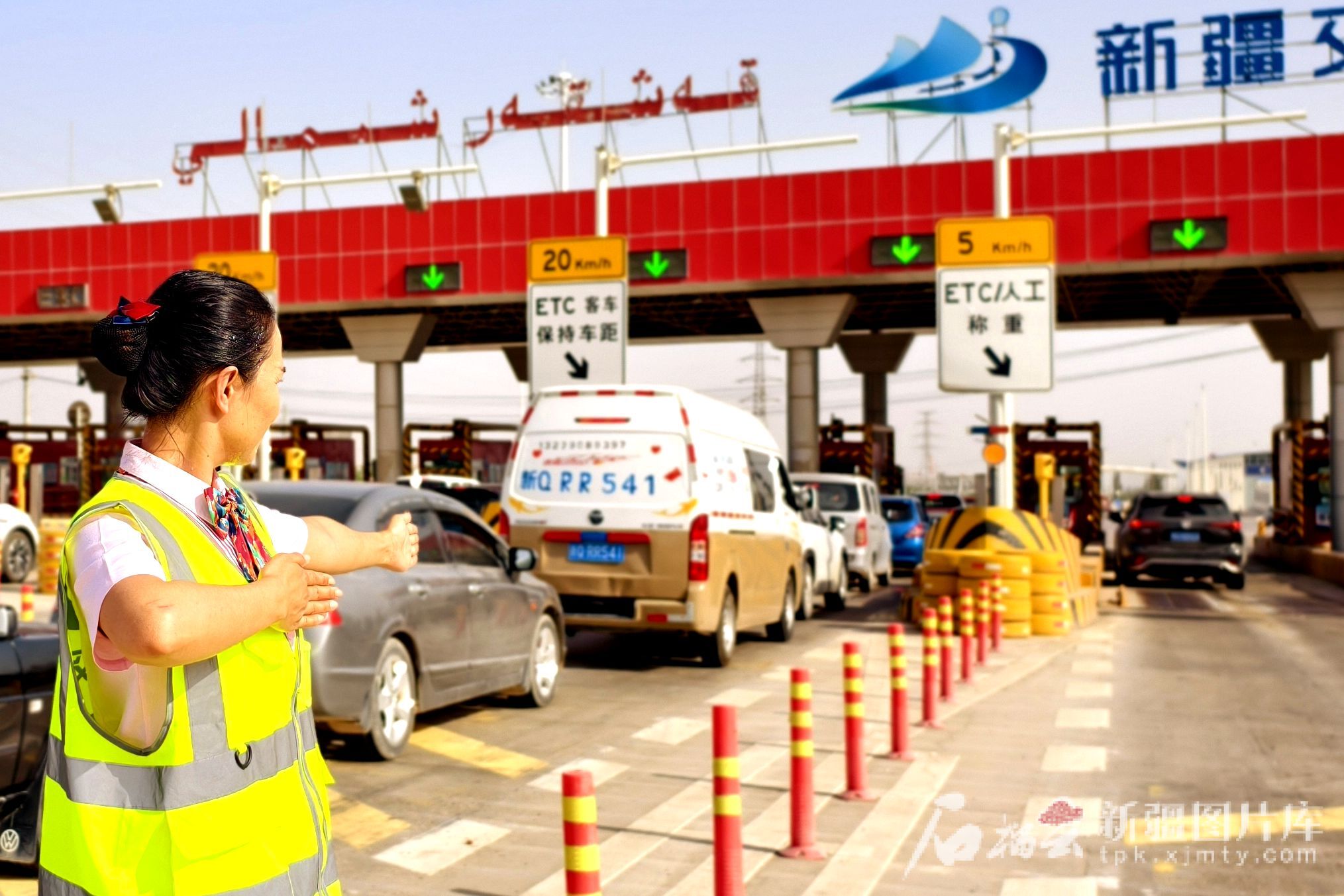 7月7日,G3012吐和高速喀什北收費站車流高峰期,執(zhí)勤員古麗尼格爾·薩力在烈日下引導(dǎo)車輛。廖婷攝