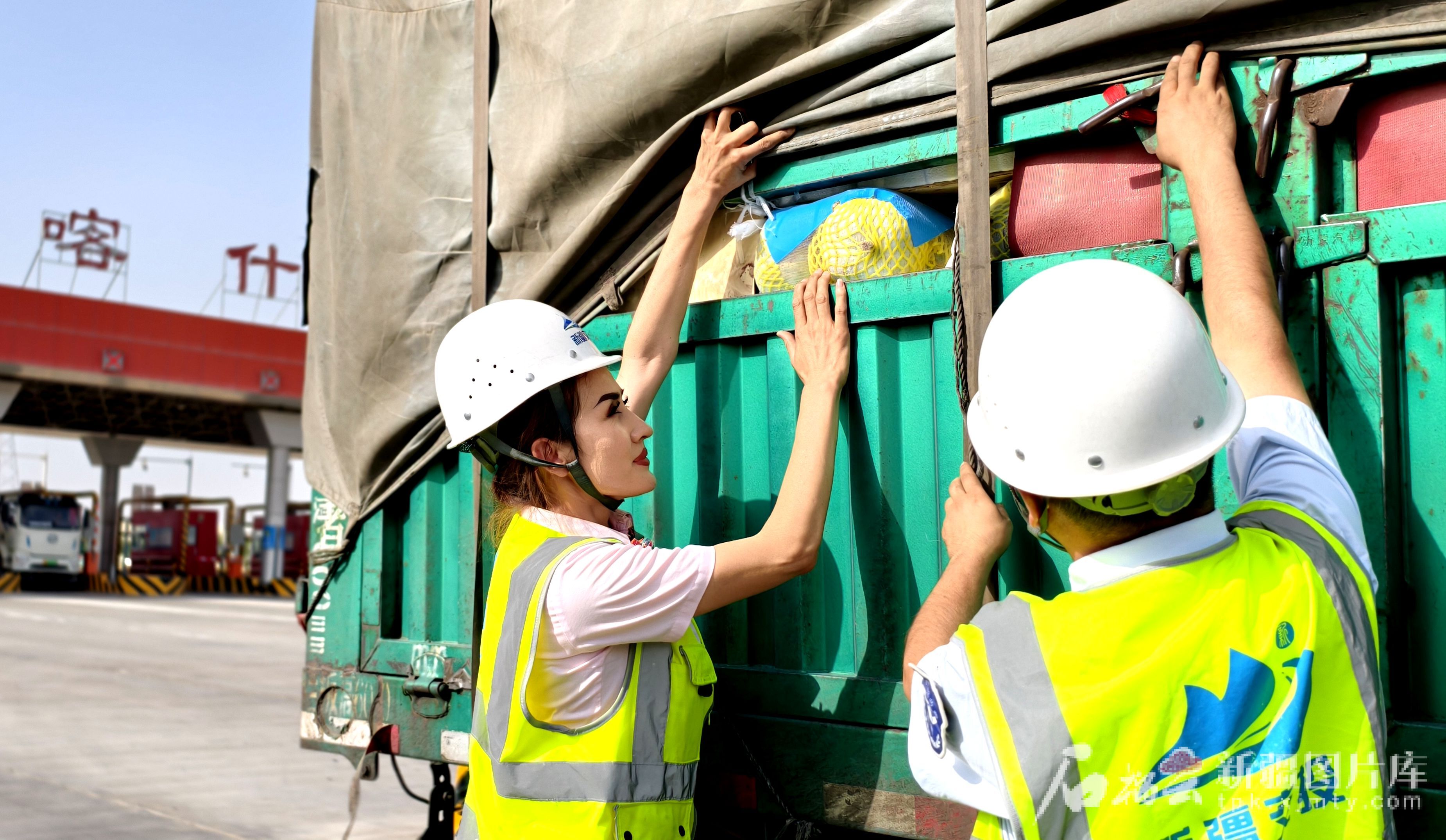 綠通查驗現(xiàn)場同樣忙碌??κ脖笔召M站收費員約斯妮古麗·蘇萊曼創(chuàng)新“快速核驗法”,引導(dǎo)車輛至陰涼處??亢?,快速掀開篷布核查貨物,全程控制在3分鐘內(nèi),隨后協(xié)助司機(jī)重新密封篷布。