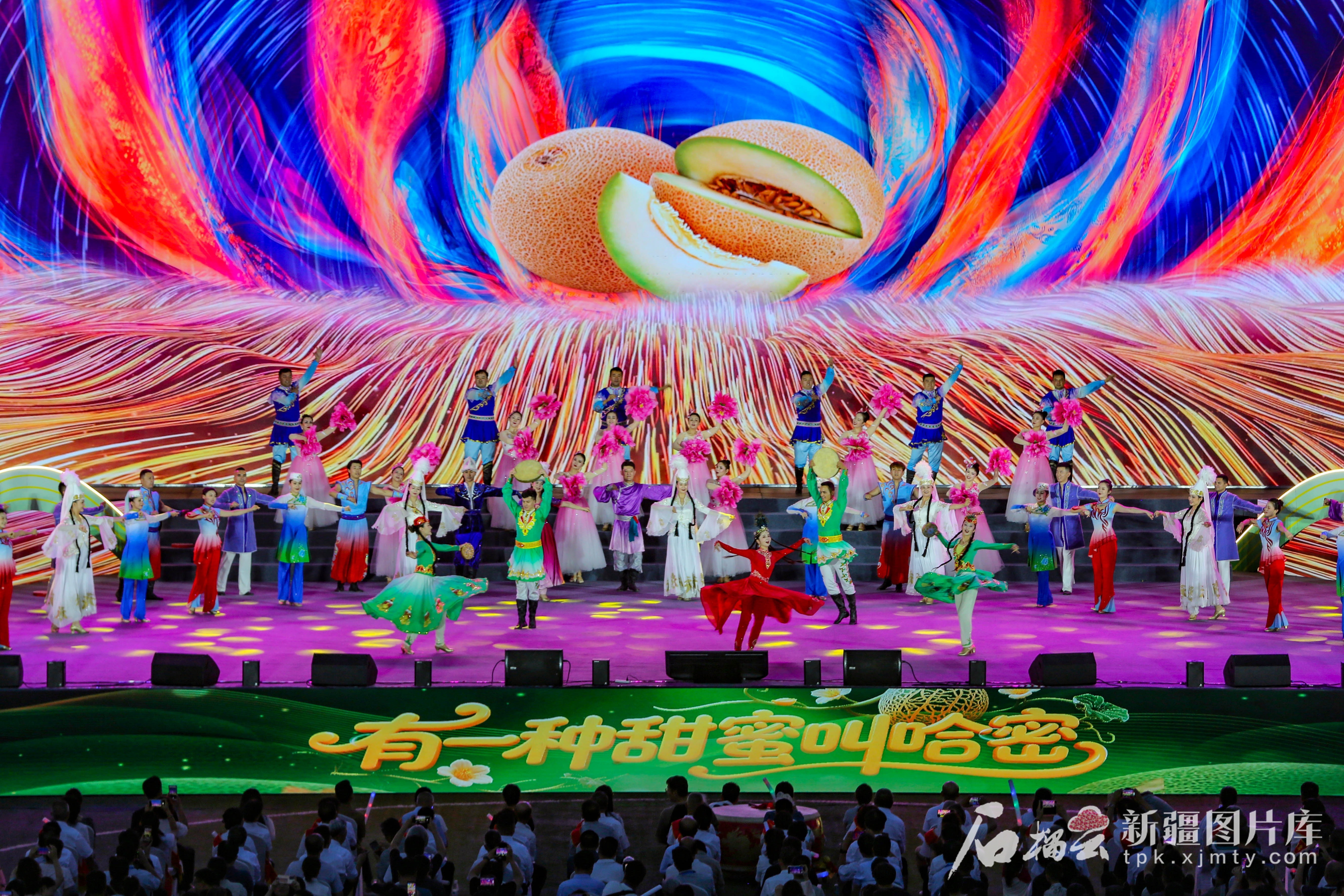 7月11日,演員在哈密市體育中心表演開場(chǎng)舞蹈《有一種甜蜜叫哈密》。