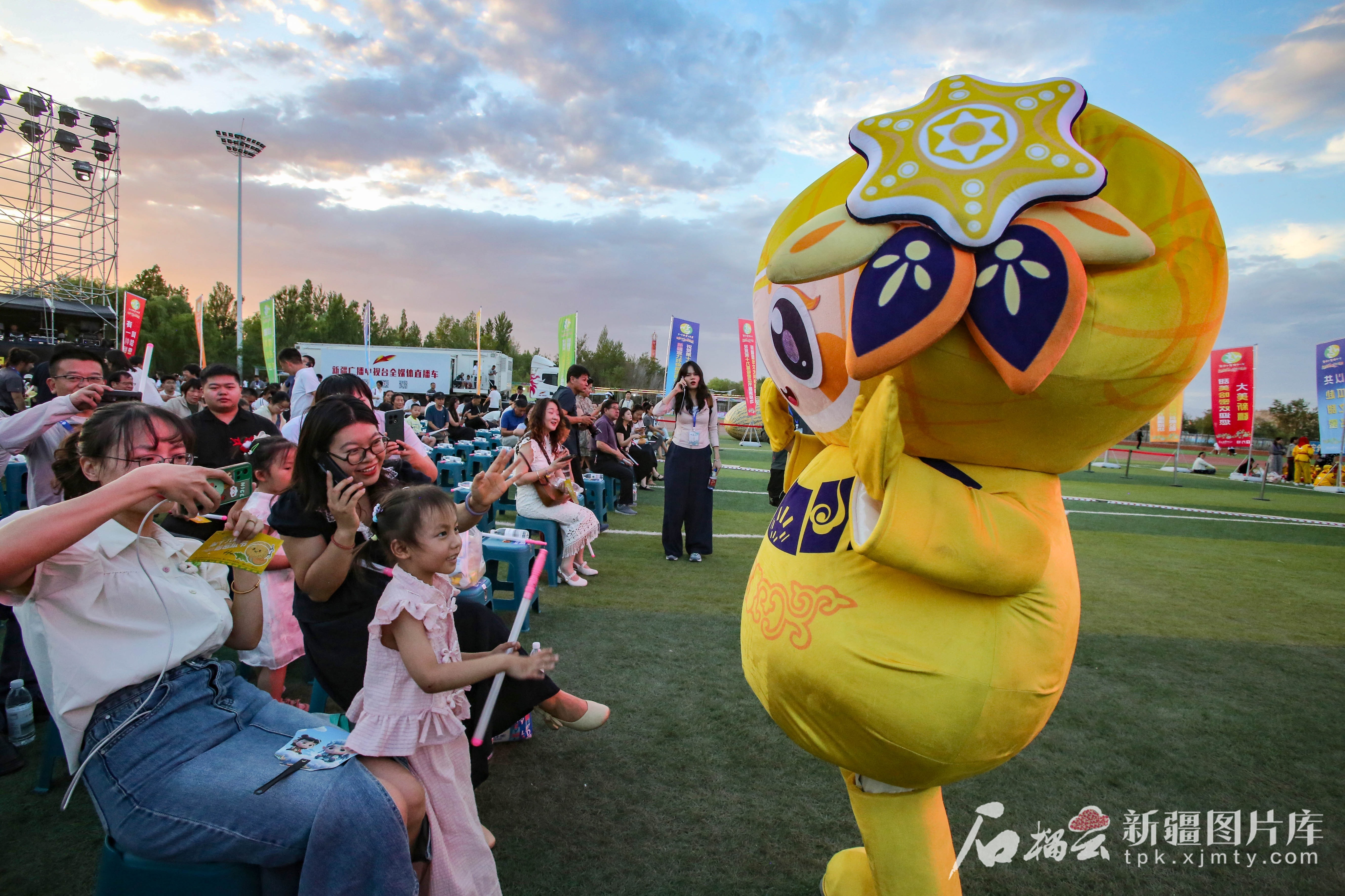 7月11日,演員身著哈密瓜卡通服飾在哈密市體育中心與觀眾互動(dòng)。
