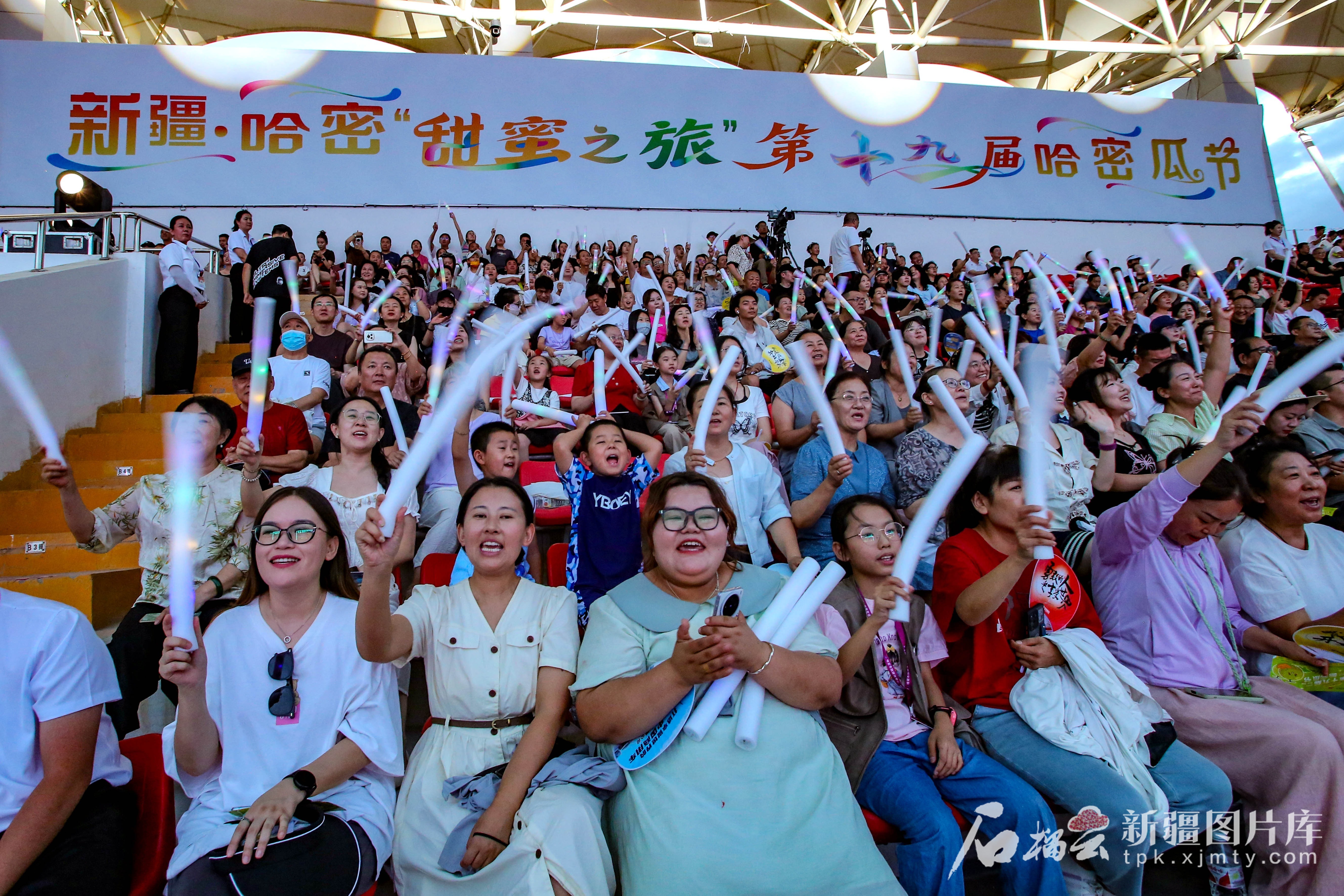 7月11日,觀眾在哈密市體育中心觀看新疆·哈密“甜蜜之旅”第十九屆哈密瓜節(jié)開幕式。