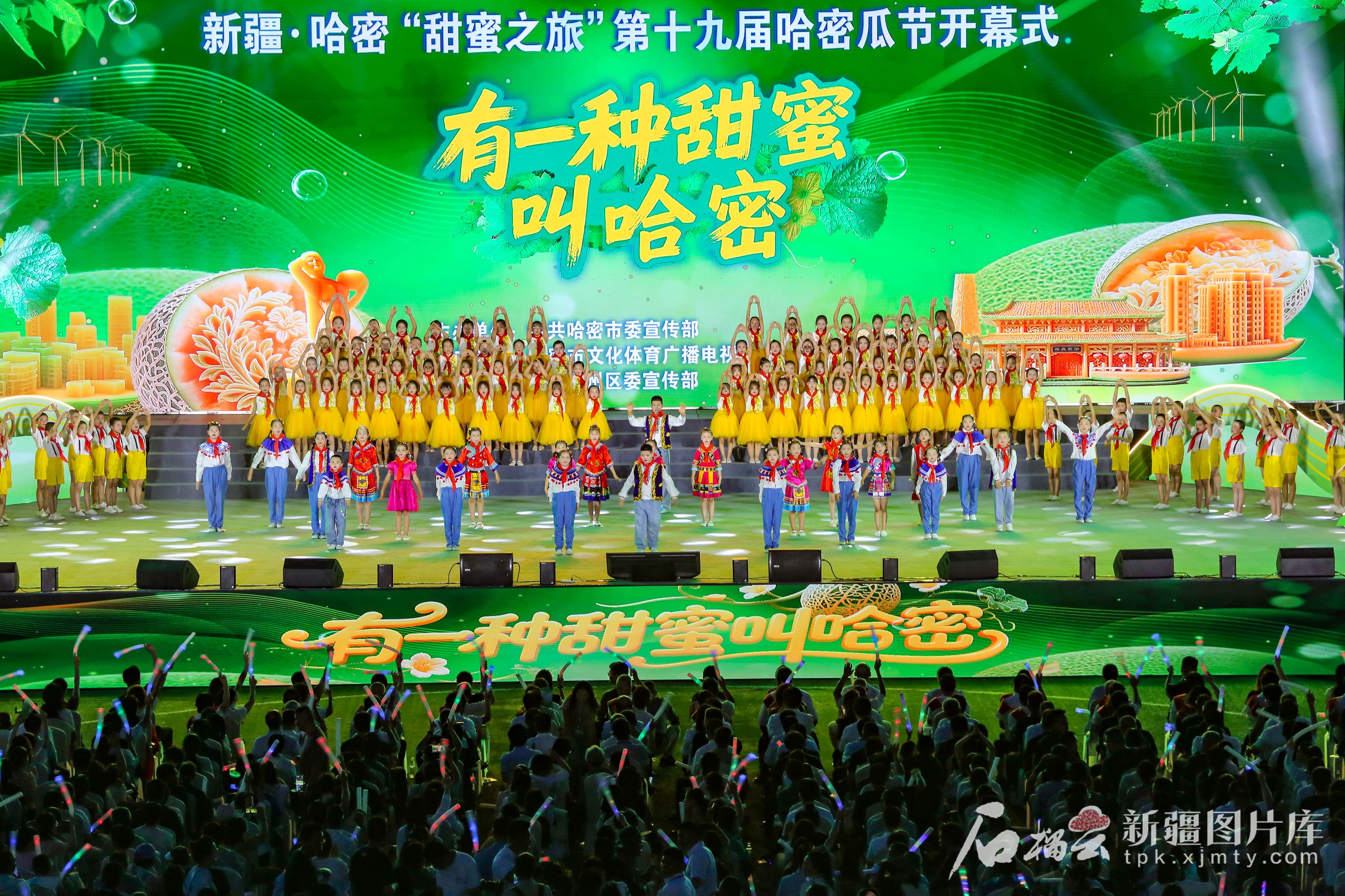 7月11日,新疆·哈密“甜蜜之旅”第十九屆哈密瓜節(jié)開幕式上小朋友們?cè)诒硌萃暫铣?/span>