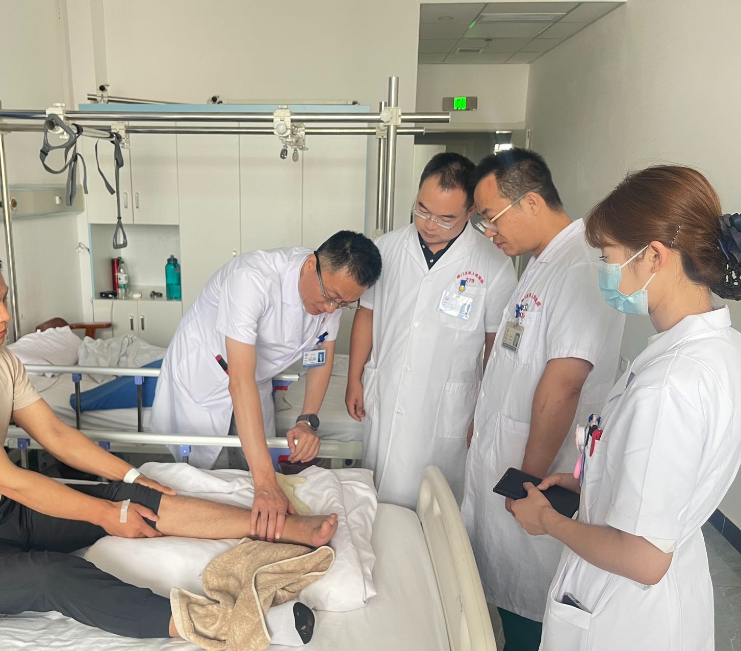 7月10日,在鐵門關(guān)市人民醫(yī)院骨科病房,該院常務(wù)副院長、援疆醫(yī)生劉建寧帶著當(dāng)?shù)蒯t(yī)生查看患者恢復(fù)情況,講解患者術(shù)后注意事項:“腳踝骨折,術(shù)后要注意觀察患者傷口愈合情況,避免劇烈運(yùn)動。”