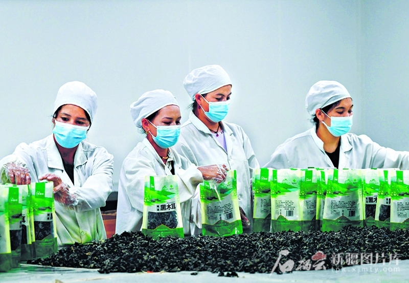 6月30日,工人在疏勒縣魯疆情食用菌生態(tài)科技示范園生產(chǎn)車間包裝木耳。目前,該示范園擁有26座標(biāo)準(zhǔn)化生產(chǎn)大棚,主要種植羊肚菌、猴頭菇等14種珍稀食用菌,年產(chǎn)食用菌干品300余噸。 天山網(wǎng)-新疆日報記者 約提克爾·尼加提攝