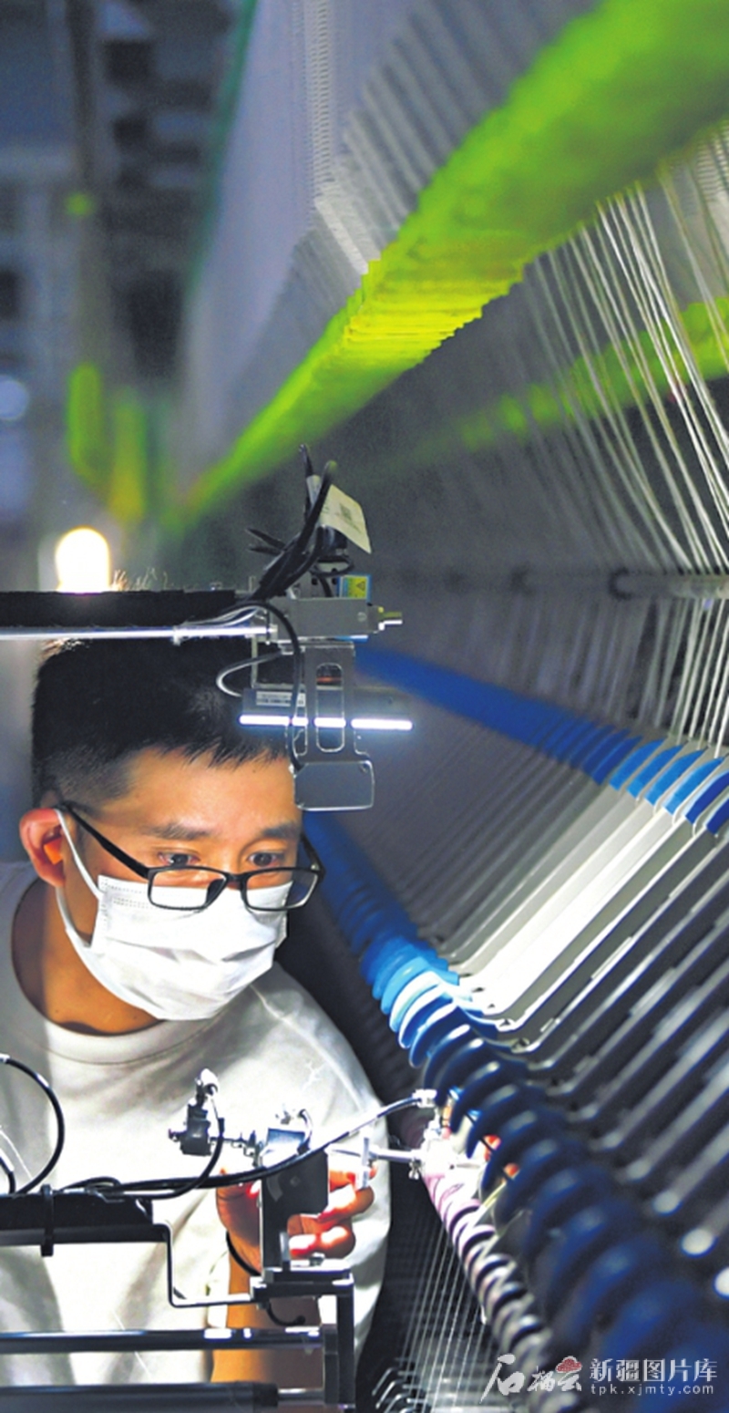 6月20日,庫車?yán)A紡織有限公司技術(shù)員在調(diào)試智能設(shè)備,這里是新疆首批25家5G全連接工廠之一。 天山網(wǎng)-新疆日報記者 鄒懿攝