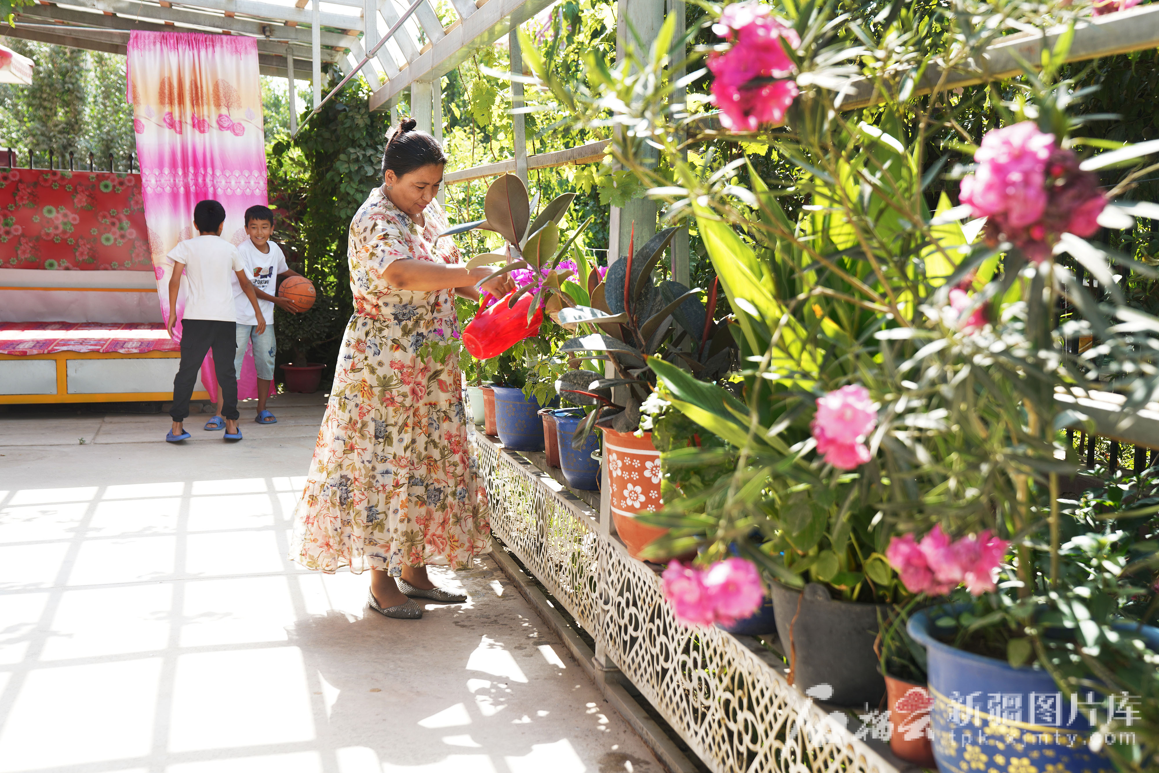 7月5日,葉城縣阿克塔什鎮(zhèn),棋盤鄉(xiāng)吾讓村的村民吐爾遜古麗·阿吾提在打理自家小院。她家在鎮(zhèn)上開超市,兩個孩子在南方上大學。