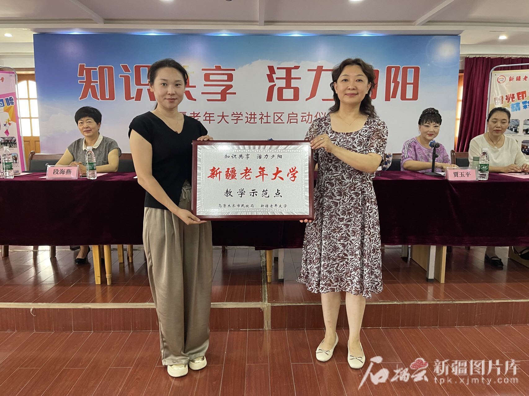 7月16日,新疆老年大學(xué)校長(zhǎng)周瑾(右)向青海路社區(qū)新疆老年大學(xué)教學(xué)示范點(diǎn)授牌。記者 任華攝