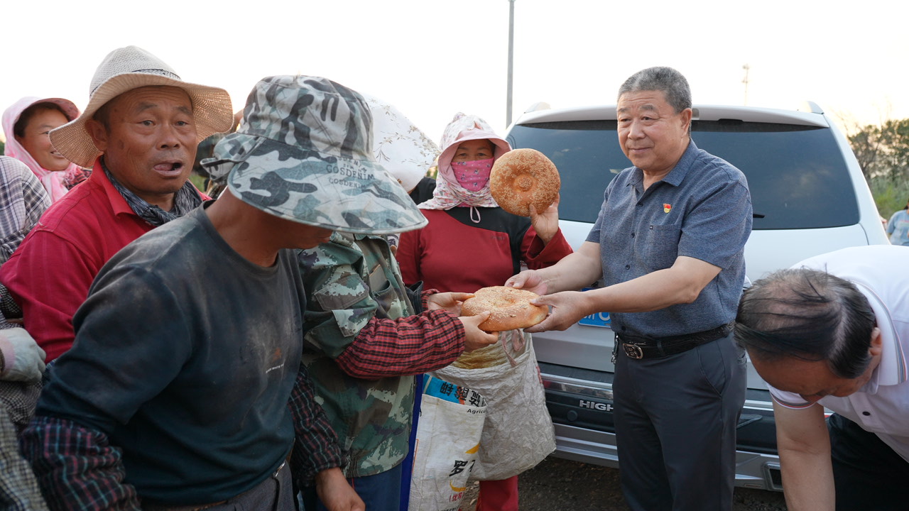 老干一黨支部的老黨員將綠豆湯、熱馕、西瓜、甜瓜遞到拾花工手中