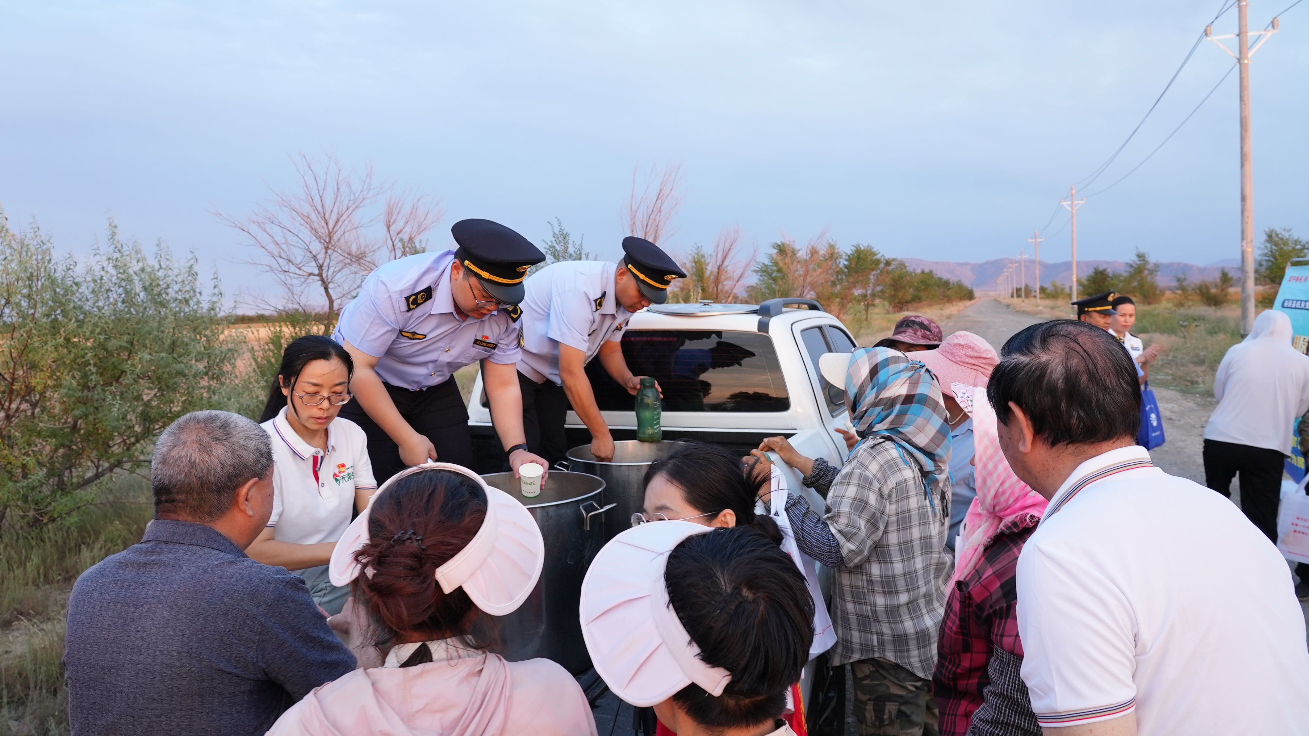 拾花工桑永英說:“這些單位想的真周到,老黨員們送來的大西瓜、馕餅、綠豆湯,真的太暖心了,還給我們發(fā)了些解暑的藥,民警關(guān)心我們的安全,我們心里面真的踏實(shí)多了,這服務(wù)送到我們心坎上了?!?/p>