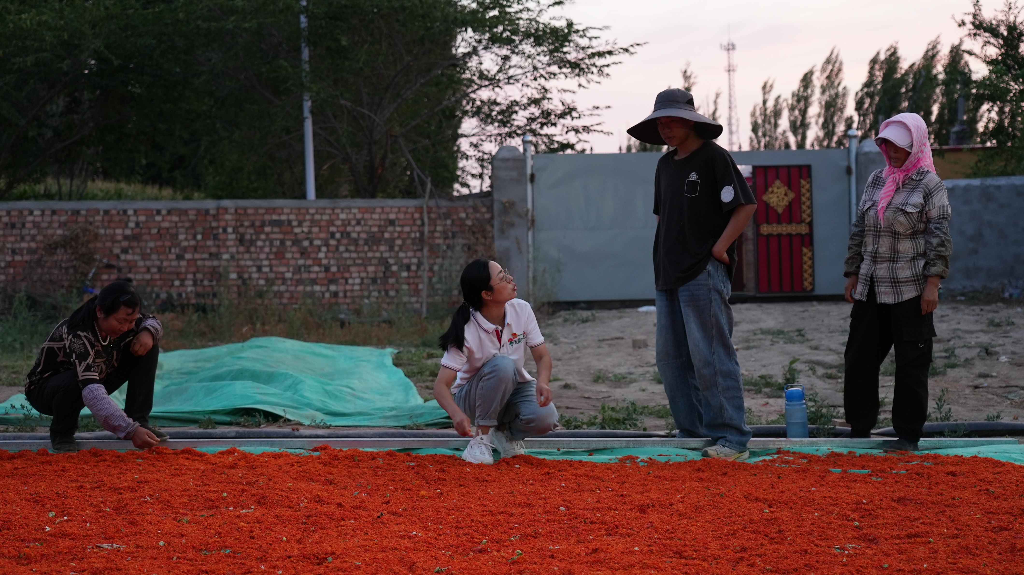 技術(shù)人員正在給拾花工和種植戶講解紅花絲晾曬的注意事項(xiàng)