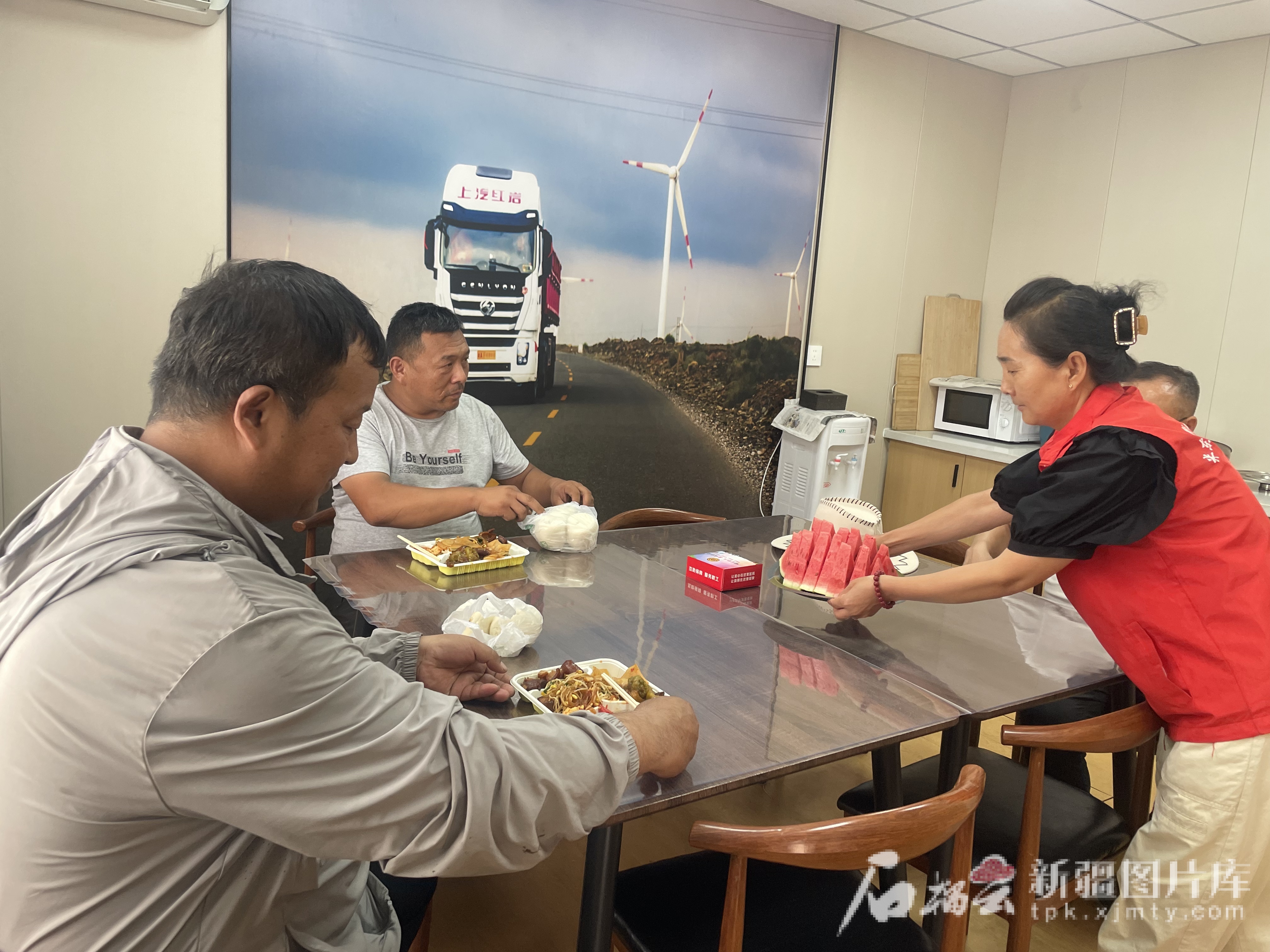 7月16日正午,在新華凌市場北區(qū)物流區(qū)“司機之家”,社區(qū)工作人員正給大貨車司機送西瓜。天山網(wǎng)-新疆日報記者 索蓉芝攝