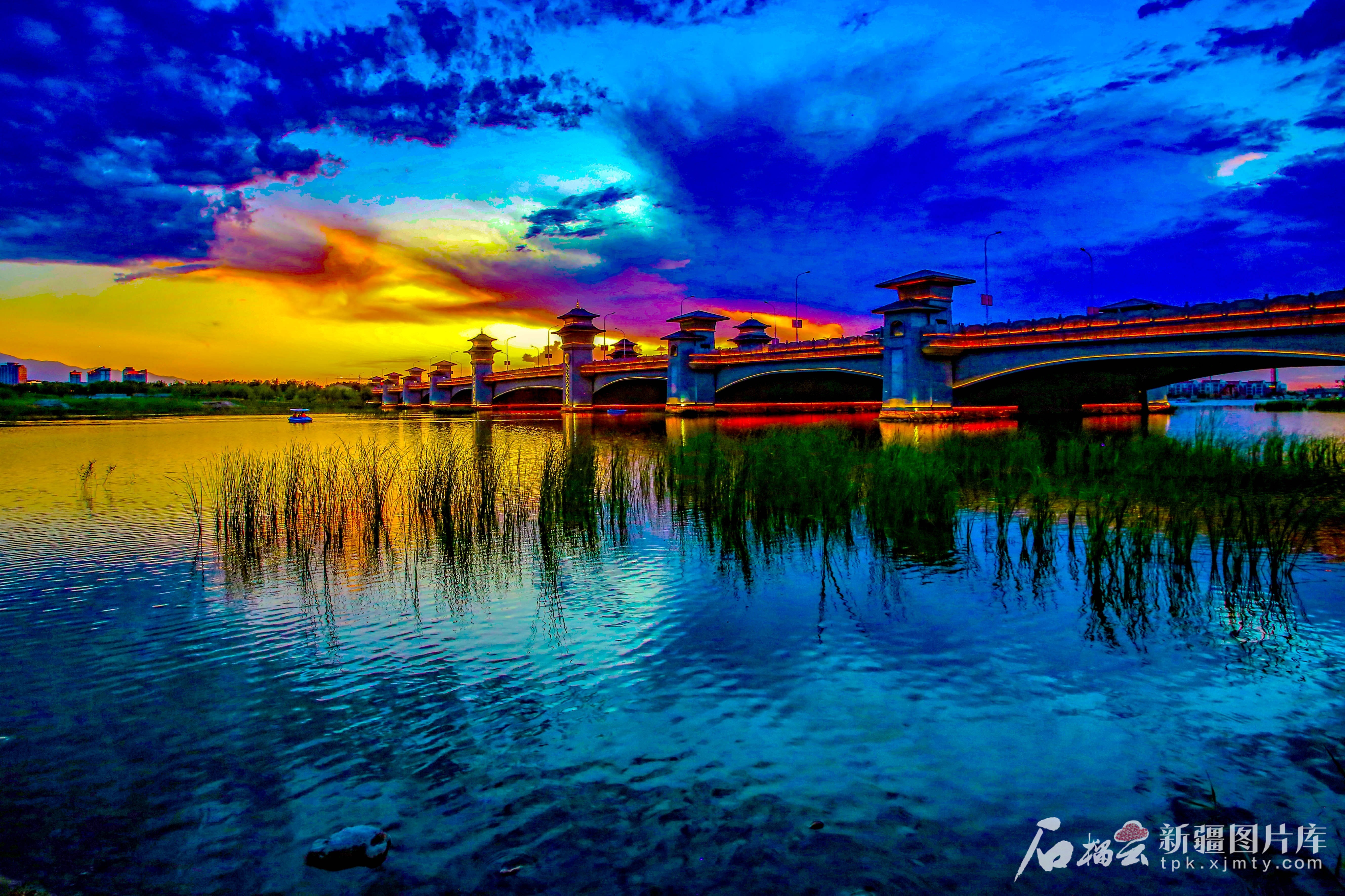 夏夜時(shí)分,在吉木薩爾縣拍攝的庭州灣景觀帶“網(wǎng)紅橋”。