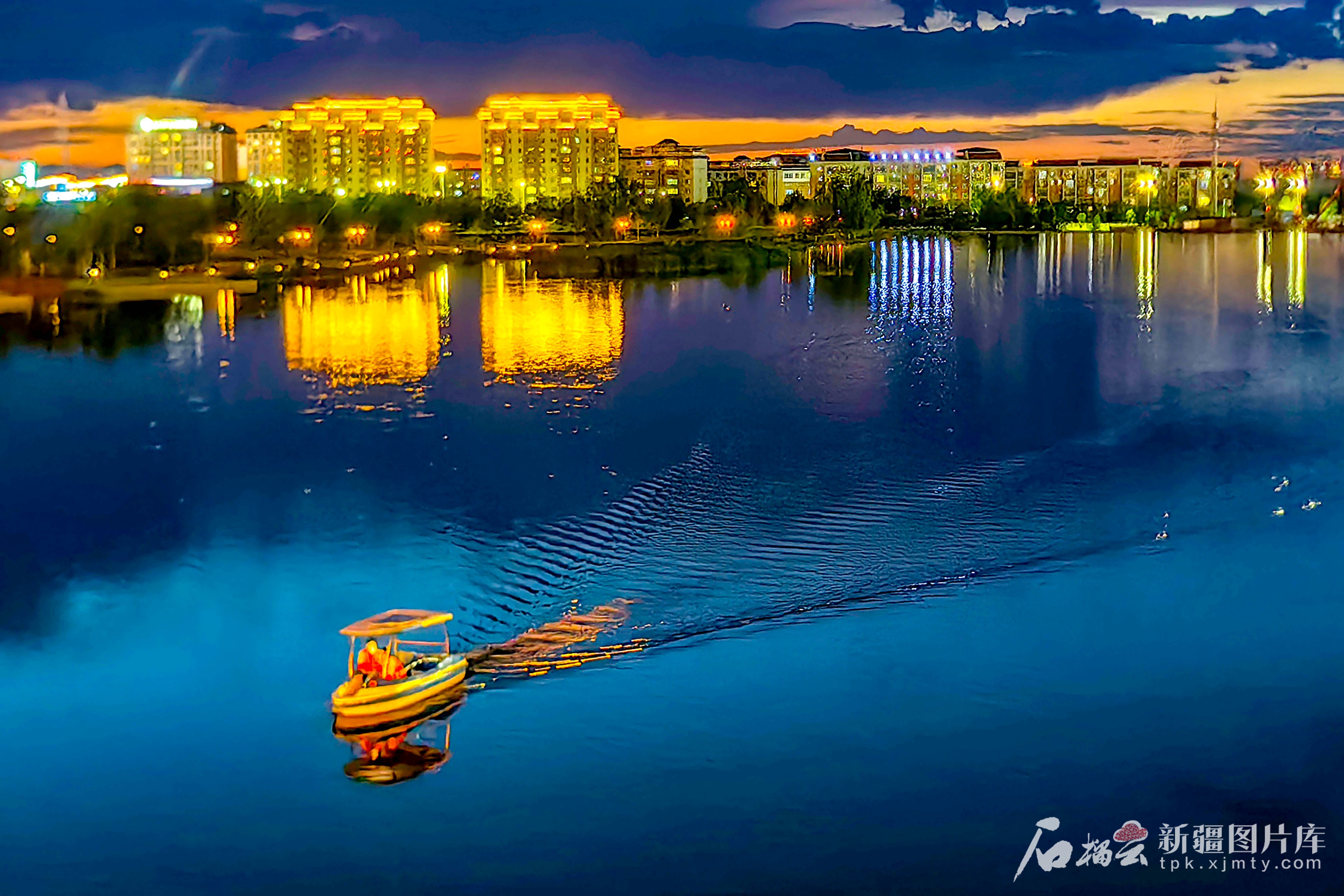 夏夜時(shí)分,游客在吉木薩爾縣庭州灣景觀帶泛舟游玩。