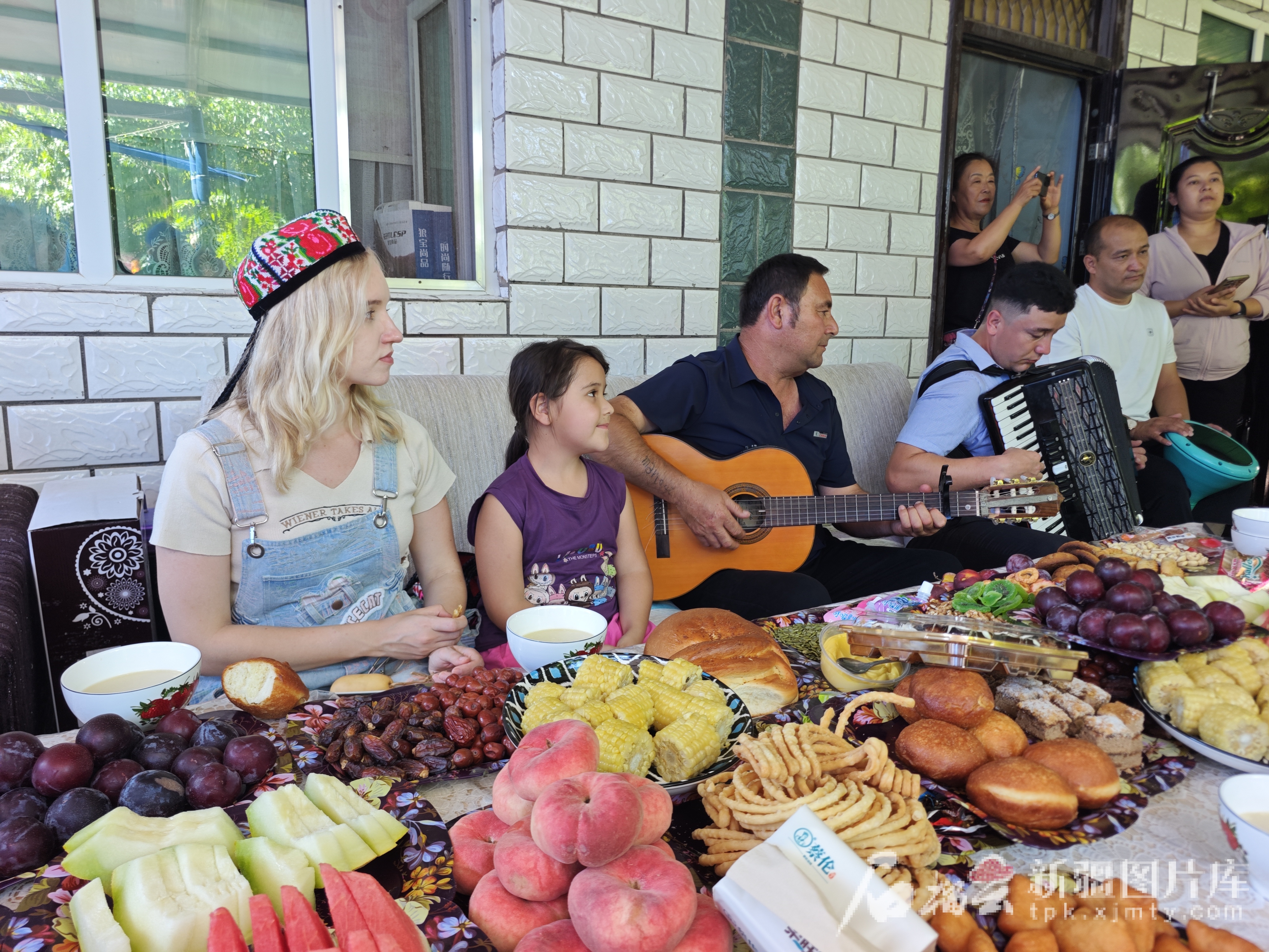 7月24日,梅麗莎(左一)在額敏縣榆柳巷欣賞居民的彈唱。朱濤攝