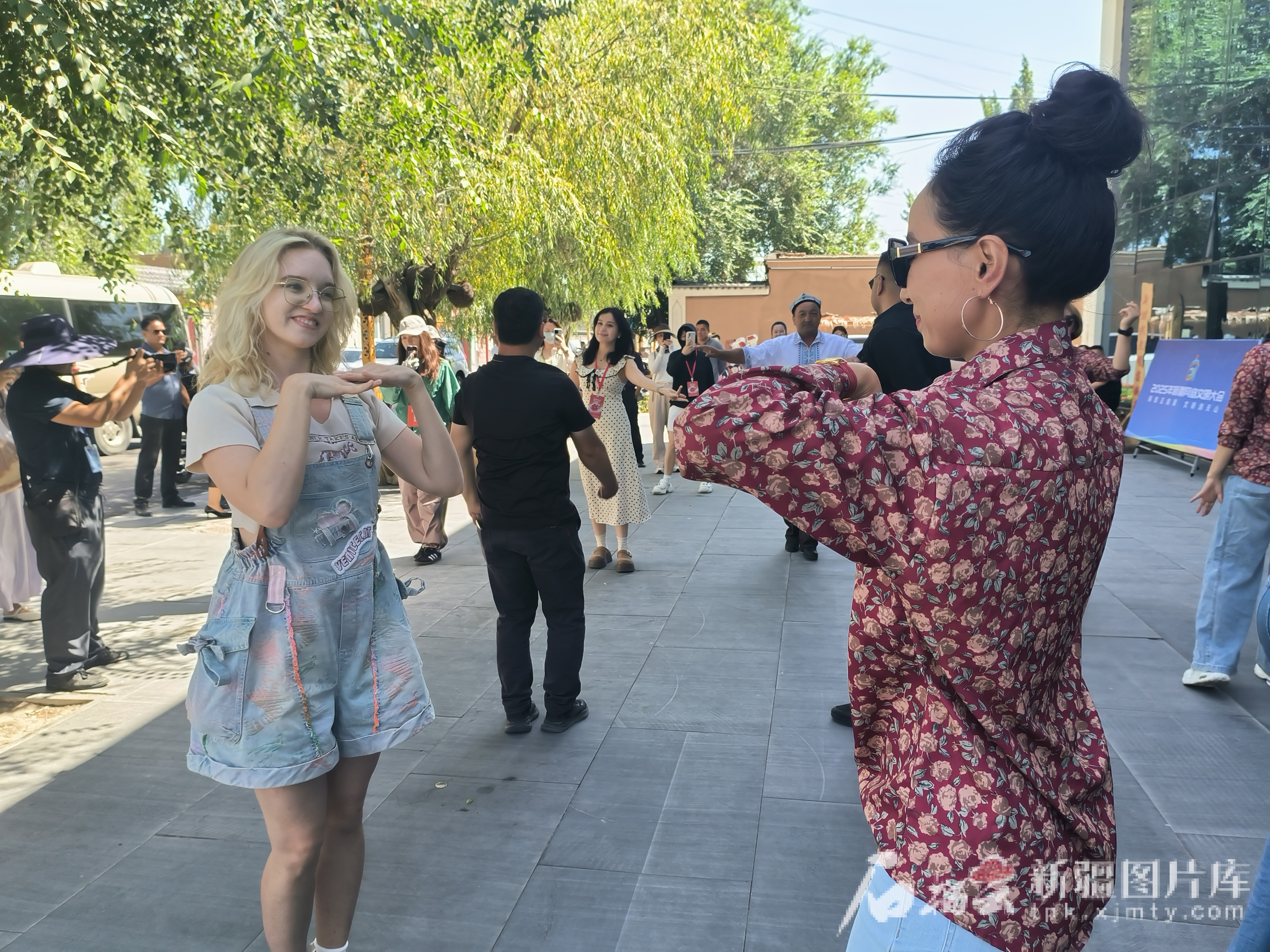 7月24日,梅麗莎(左)在額敏縣榆柳巷跟著居民學(xué)跳舞。天山網(wǎng)-新疆日報記者 甘興華攝