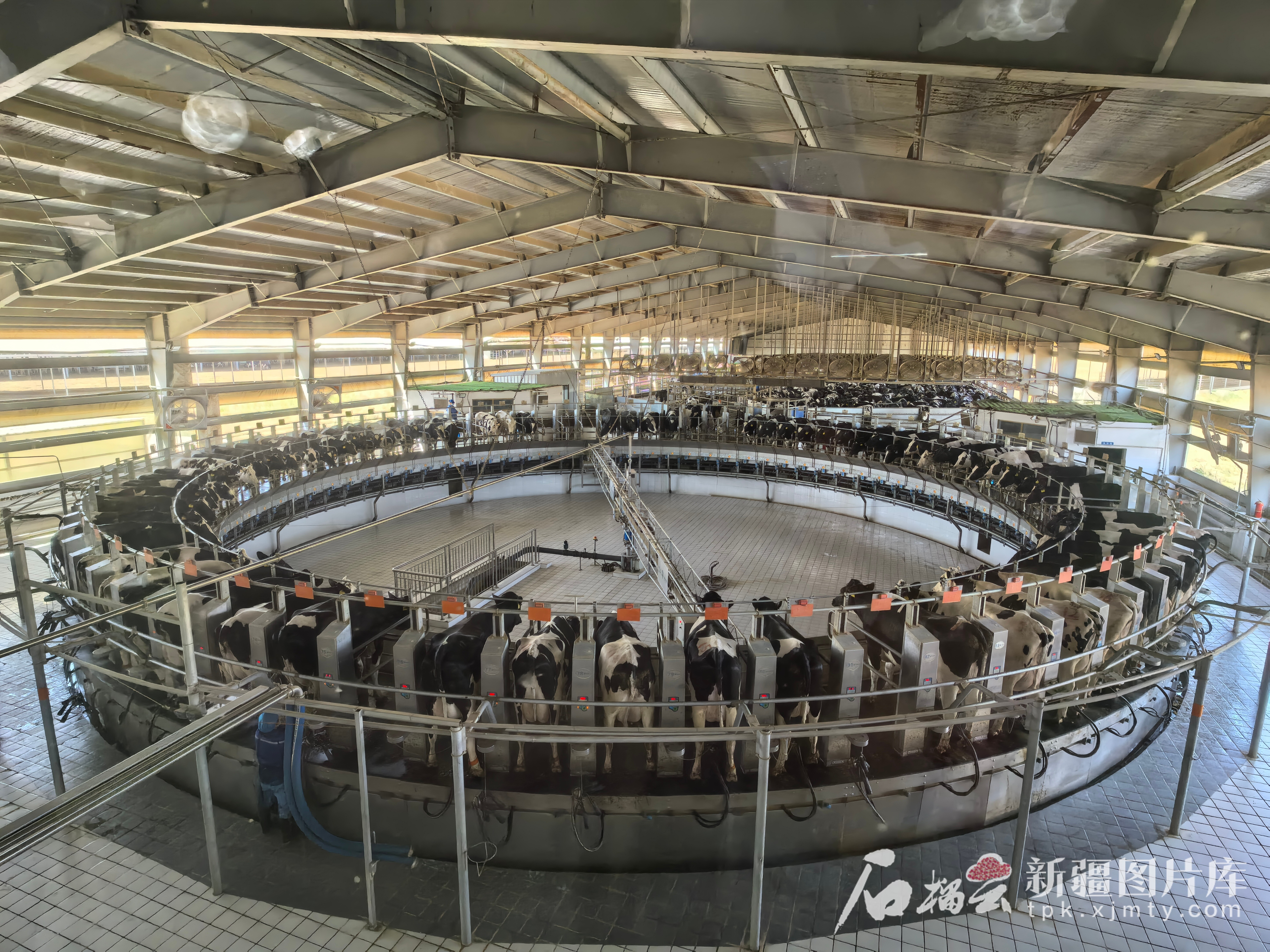 新疆天瑞祥牧業(yè)養(yǎng)殖有8000余頭奶牛,其中3000余頭奶牛需每天擠奶,日產(chǎn)鮮奶約100噸。擠奶大廳內(nèi),80個(gè)站位的擠奶轉(zhuǎn)盤(pán)緩慢旋轉(zhuǎn),奶牛在擠奶轉(zhuǎn)盤(pán)上站9分鐘,轉(zhuǎn)一圈后,擠奶罩杯自動(dòng)脫落,完成擠奶。