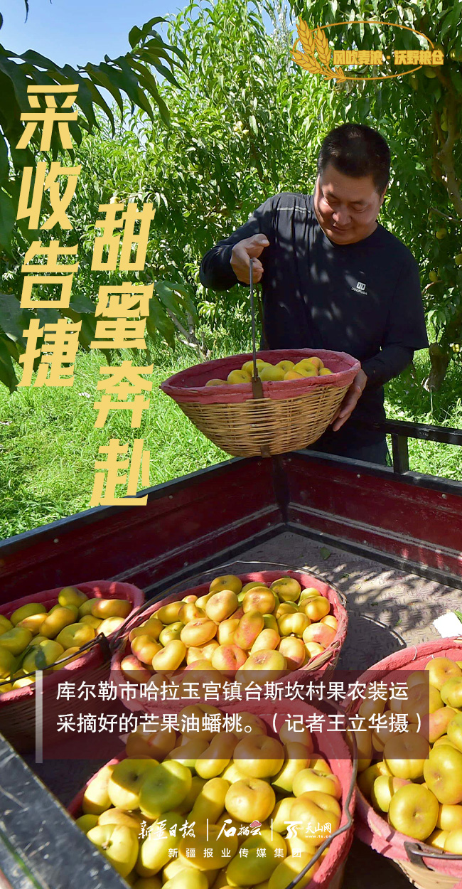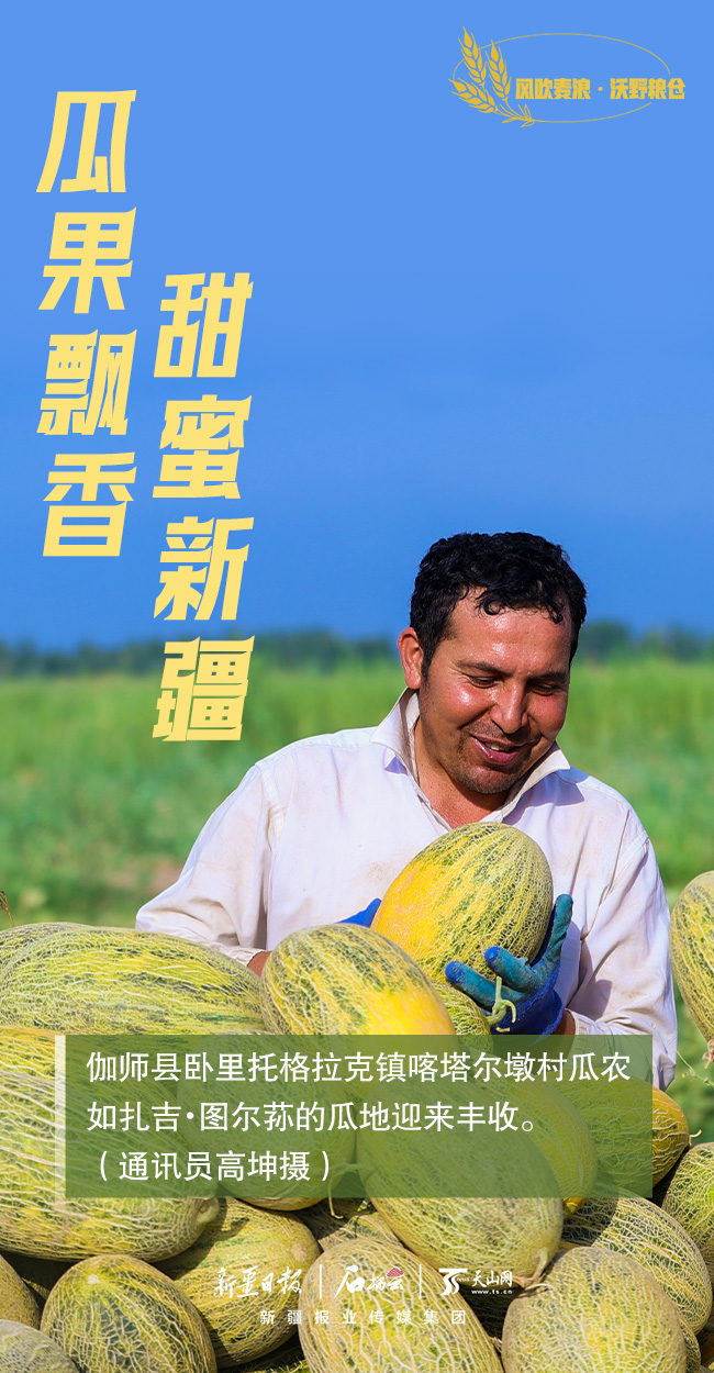 七月的新疆,是一幅流淌著蜜與光的畫卷。廣袤的麥田里,滿目金黃,豐饒的果園里,瓜果飄香。從沙漠腹地到天山腳下,大地的每一次慷慨饋贈(zèng),都化作了人們眉眼間的喜悅。豐收的喜悅與瓜果的香氣一同構(gòu)成了這個(gè)夏天最動(dòng)人的畫面。一組海報(bào),帶你領(lǐng)略夏收里的新疆。