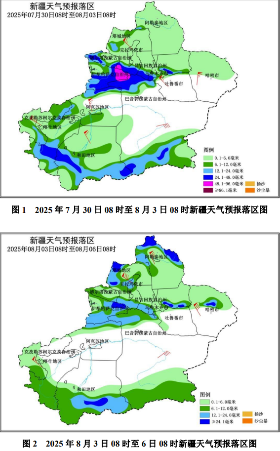 預(yù)報顯示,7月30日至8月2日,全疆自西向東將迎來首輪強(qiáng)降水。伊犁河谷、博爾塔拉蒙古自治州、塔城地區(qū)南部山區(qū)、石河子市南部山區(qū)、烏魯木齊市山區(qū)、昌吉回族自治州山區(qū),以及南疆的喀什地區(qū)南部、和田地區(qū)、阿克蘇地區(qū)、巴音郭楞蒙古自治州部分山區(qū)累計降水量預(yù)計達(dá)40—70毫米,局地將出現(xiàn)暴雨甚至大暴雨。強(qiáng)降水時段:伊犁河谷等地集中在30日白天至夜間,博州至昌吉州山區(qū)則主要在30日夜間至31日夜間。