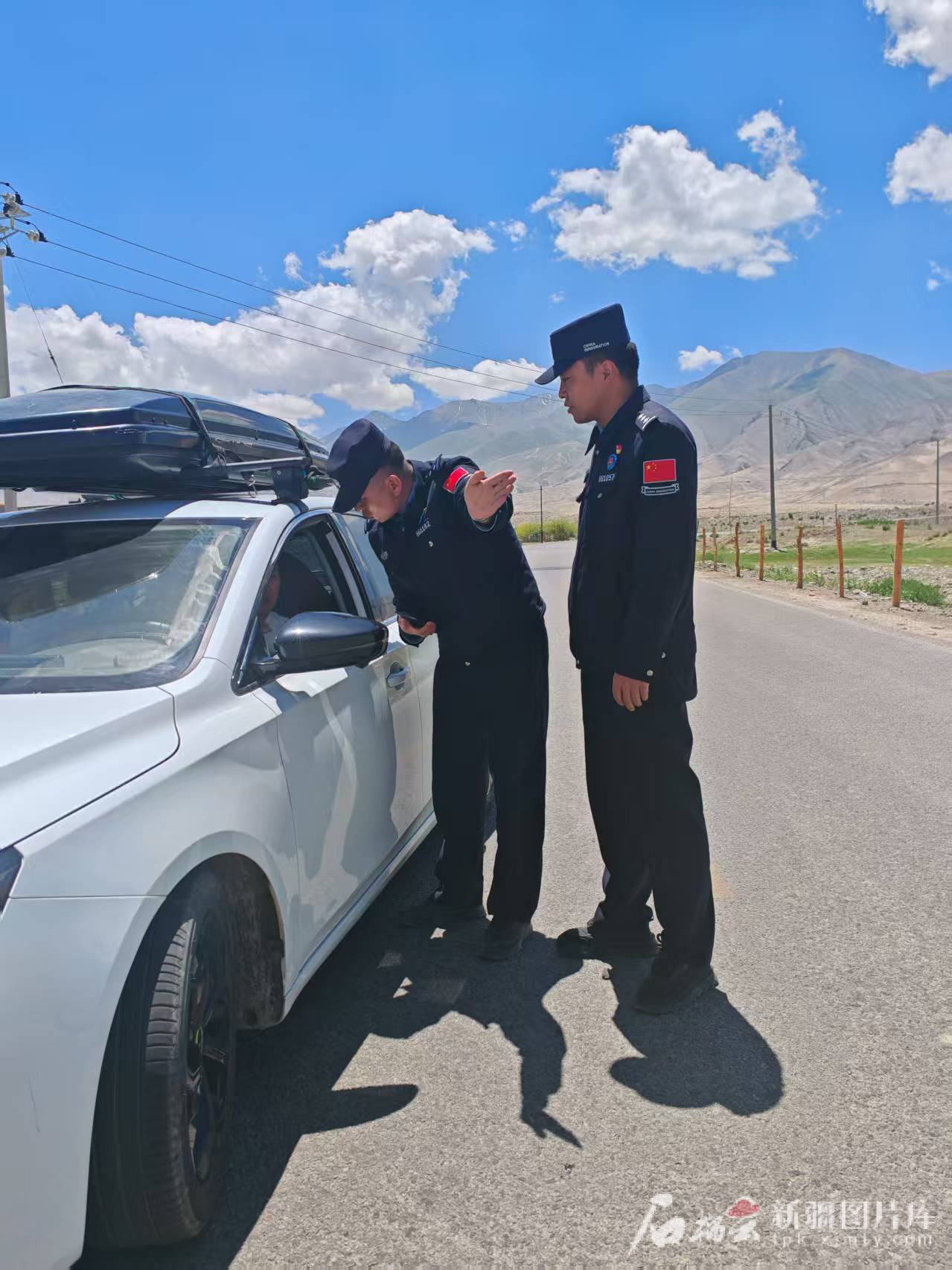 7月3日,瓦恰邊境派出所民警為游客指路。天山網(wǎng)-新疆日報(bào)記者王娜攝