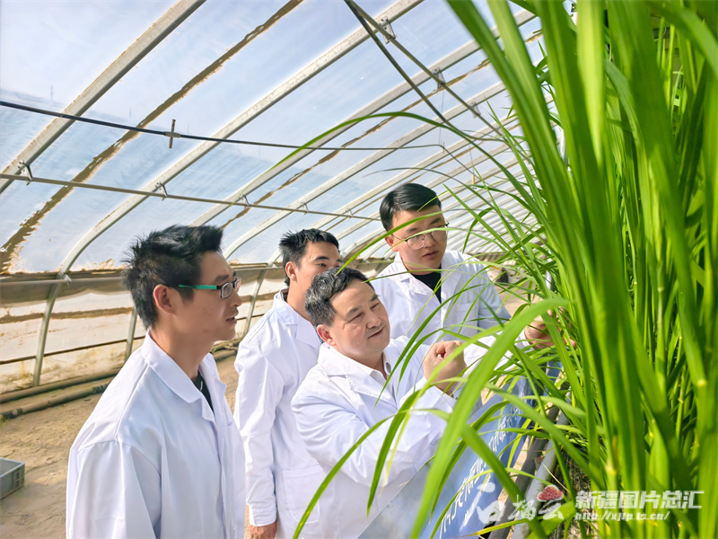 和田地區(qū)和田縣萬畝設(shè)施農(nóng)業(yè)基地沙漠溫室水稻種植大棚內(nèi),中國農(nóng)業(yè)科學(xué)院都市農(nóng)業(yè)研究所首席科學(xué)家楊其長團(tuán)隊(duì)正在查看水稻長勢(shì)。胡禮政攝