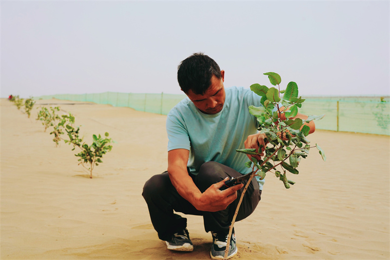 農(nóng)民正在忙著給開心果苗修剪側(cè)枝。買提努日·買提肉孜 攝